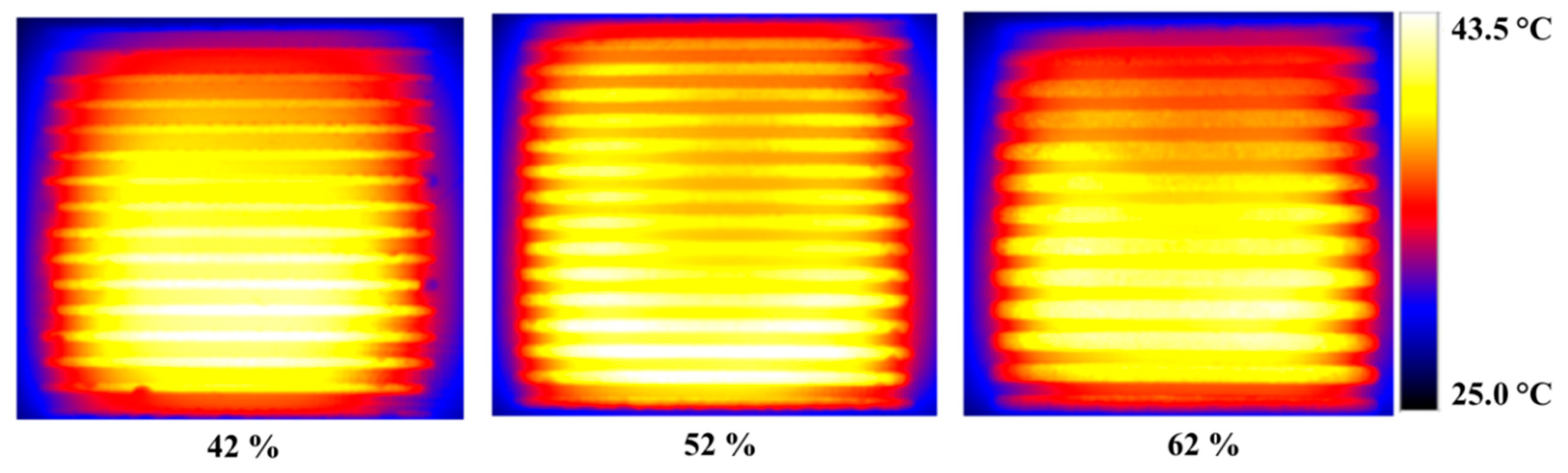 Images showing the effect of the opening ratio (i.e., the area of electrode exposed to the atmosphere) of an air breathing PEMFC obtained by Obeisun et al. [39]. Heterogeneous temperature distribution is clearly visible on the cell due to non-uniform clamping forces and the flow configuration in the system. Water formation can be seen at the edges of the cell at the 42% opening ratio. Reproduced with permission from [39].