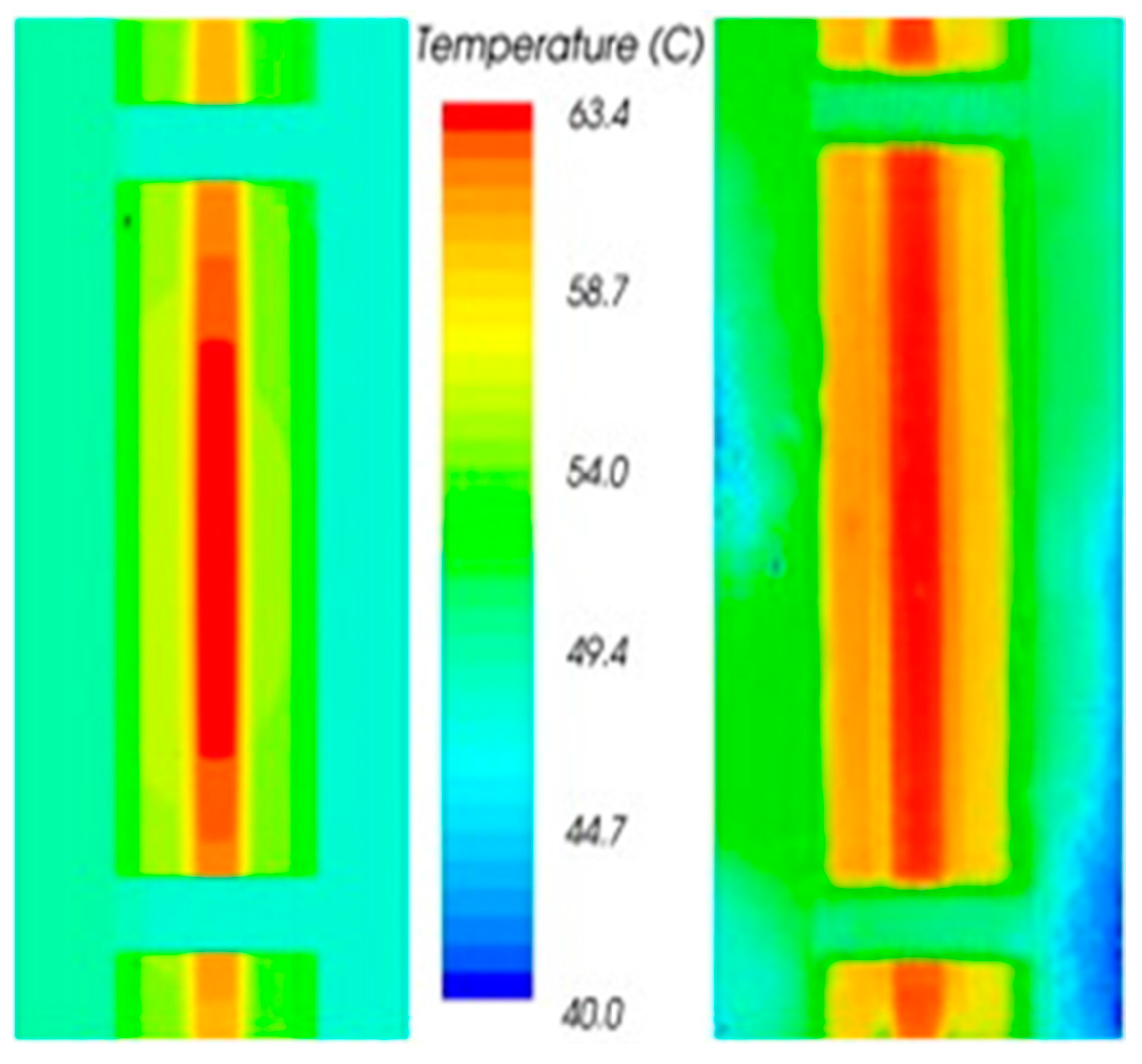 Comparison of the temperature distribution of a two cell PEMFC system obtained using finite element analysis (left) and thermal imaging (right) reported by Matian et al. [42]. Good agreement is seen between the computational and experimental results, highlighting the impact of thermal imaging as a tool for model validation. Reprinted from [42] with permission from Elsevier.