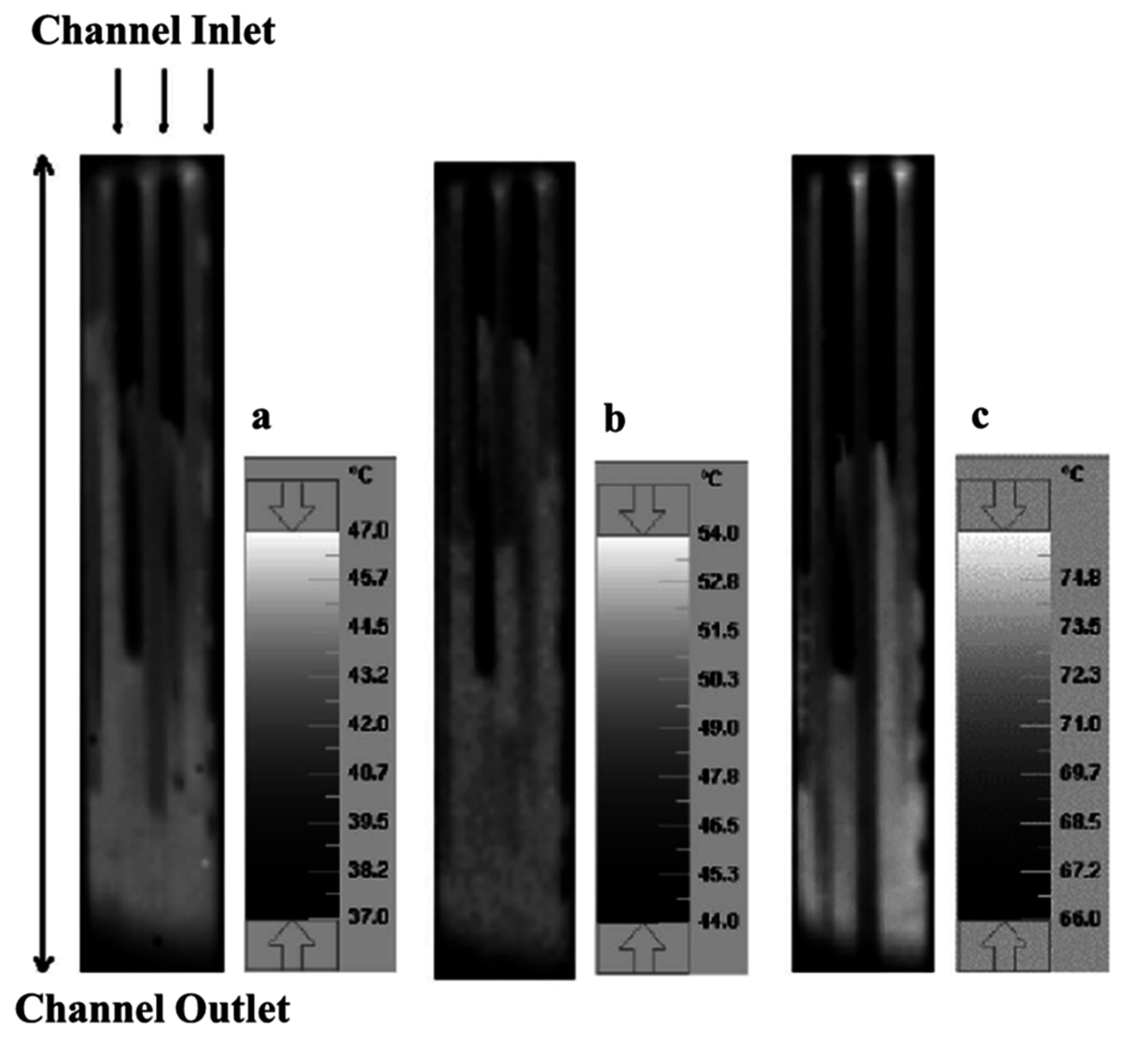 Water formation also inhibited the imaging of the cathode temperature distribution in a study reported by Guo et al. [46]. Despite this the authors were able to successfully image the anode (fuel side) of a PEMFC using a BaF2 window. As this side of the fuel cell does not produce water, condensation on the window was not observed. This study showed increased temperature activity at both edges of the system which utilised an interdigitated flow field configuration as seen in Figure 5. This was attributed to increased gas pressure in these areas, which in turn, increased the rate of electrochemical activity. A cooler region was observed in the middle of the cell which was suggested to be as a result of lower pressure due to the flow conditions. The effect of operating current densities was examined with small non-uniform temperature distributions being visible at 0.424 A·cm−2; these heterogeneities were seen to increase with increasing current densities.