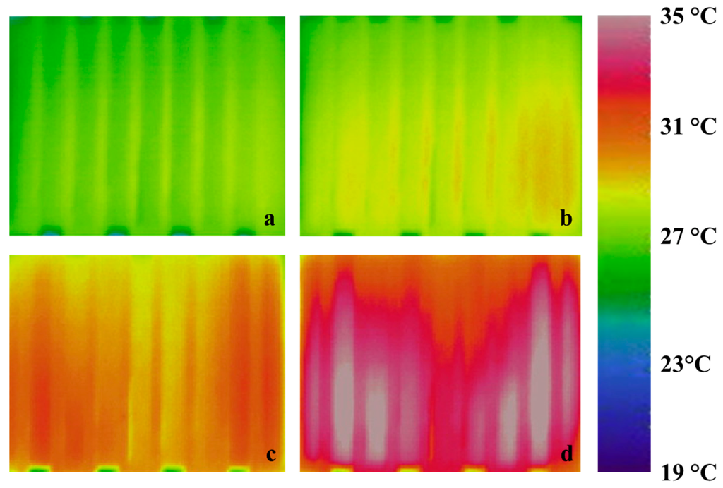 PEMFC anode temperature distribution measured through a BaF2 window by Guo et al. [46] at current densities of: (a) 424 mA·cm−2; (b) 742 mA·cm−2; (c) 1061 mA·cm−2; (d) 1379 mA·cm−2. The effect of flow direction is seen most clearly in image (d) via the cold spot located in the middle of the cell. Reprinted from [46] with permission from Elsevier.