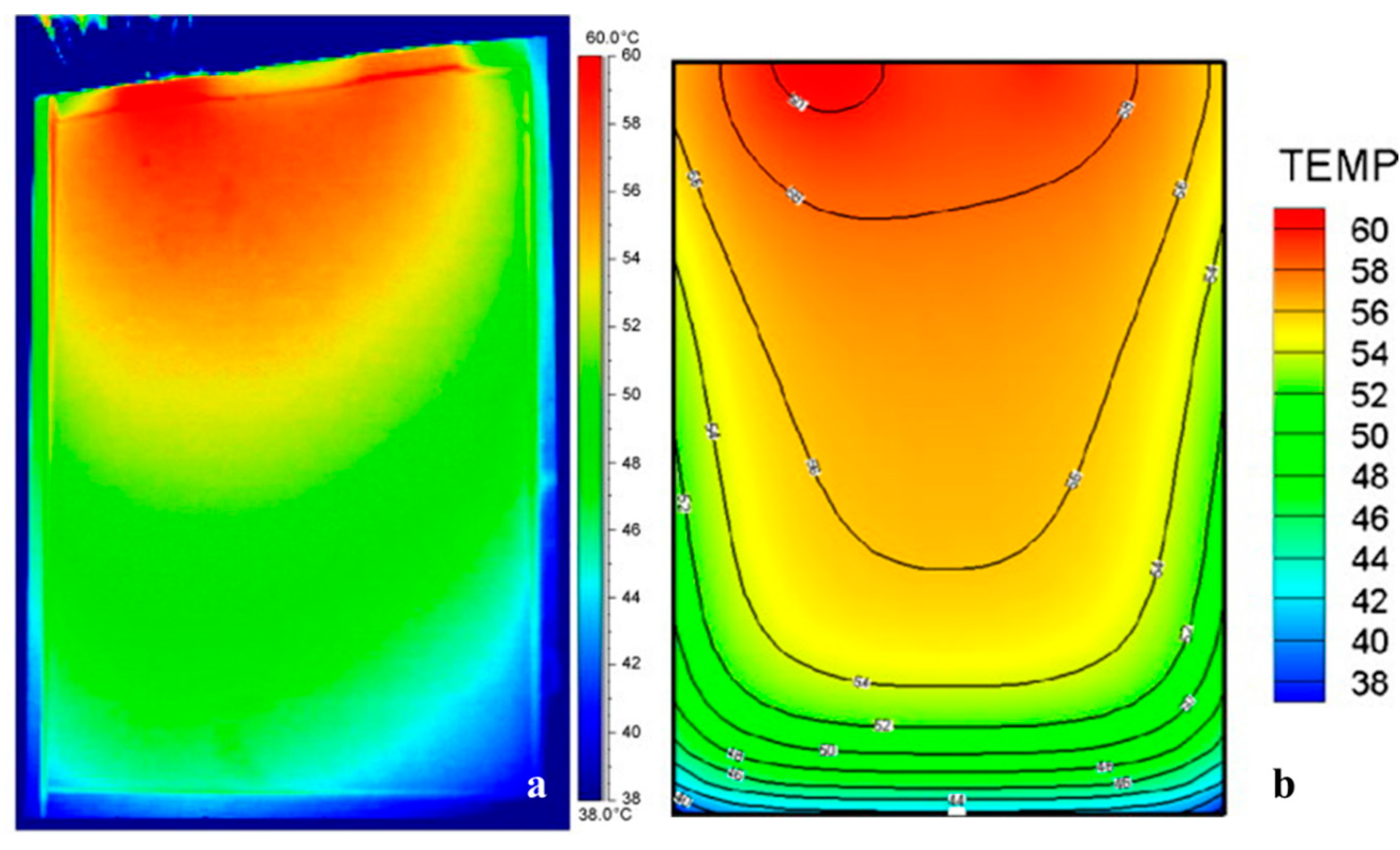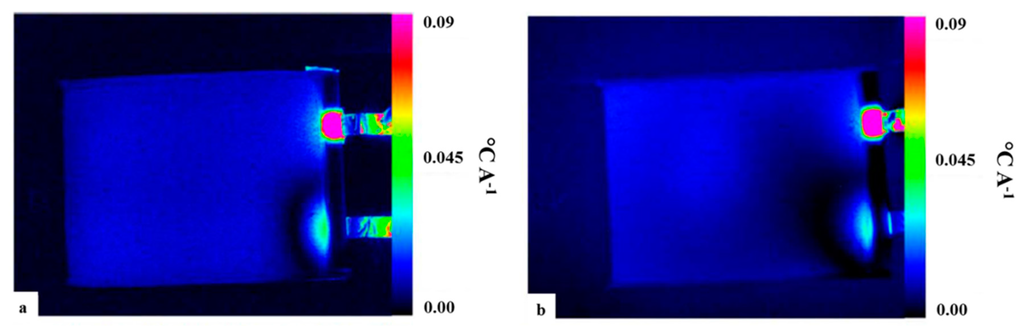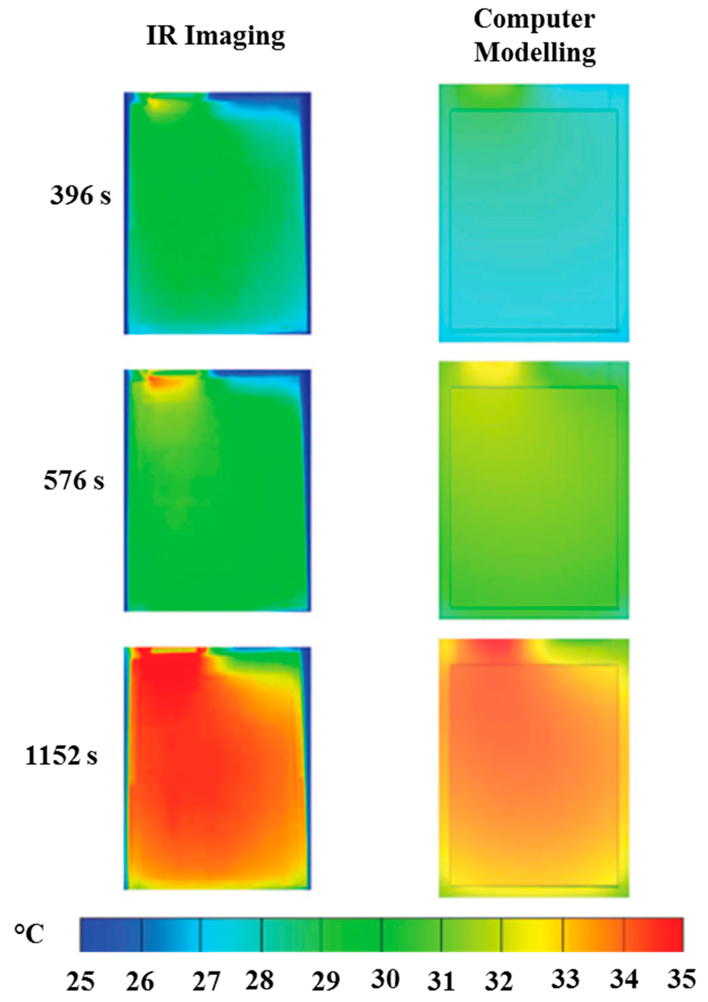 Models for Li-ion cells have also been validated using thermal imaging. Kim et al. has reported the validation of thermal models using infrared imaging [48,49], shown in Figure 6; however, these studies only compared the model to a single discharge rate of 5 C (equivalent to 130 A), with the validation images given after a discharge time of 10.8 min showing the behaviour of the battery at a very low state of charge. Similar work was performed by Wang et al. [50] who performed finite element analysis to examine the transient response of the temperature distribution on the surface of a planar cell. This model was validated using single frame thermal images taken at 5 min intervals, which showed the temperatures at the current collecting tabs were higher than the average cell temperature.