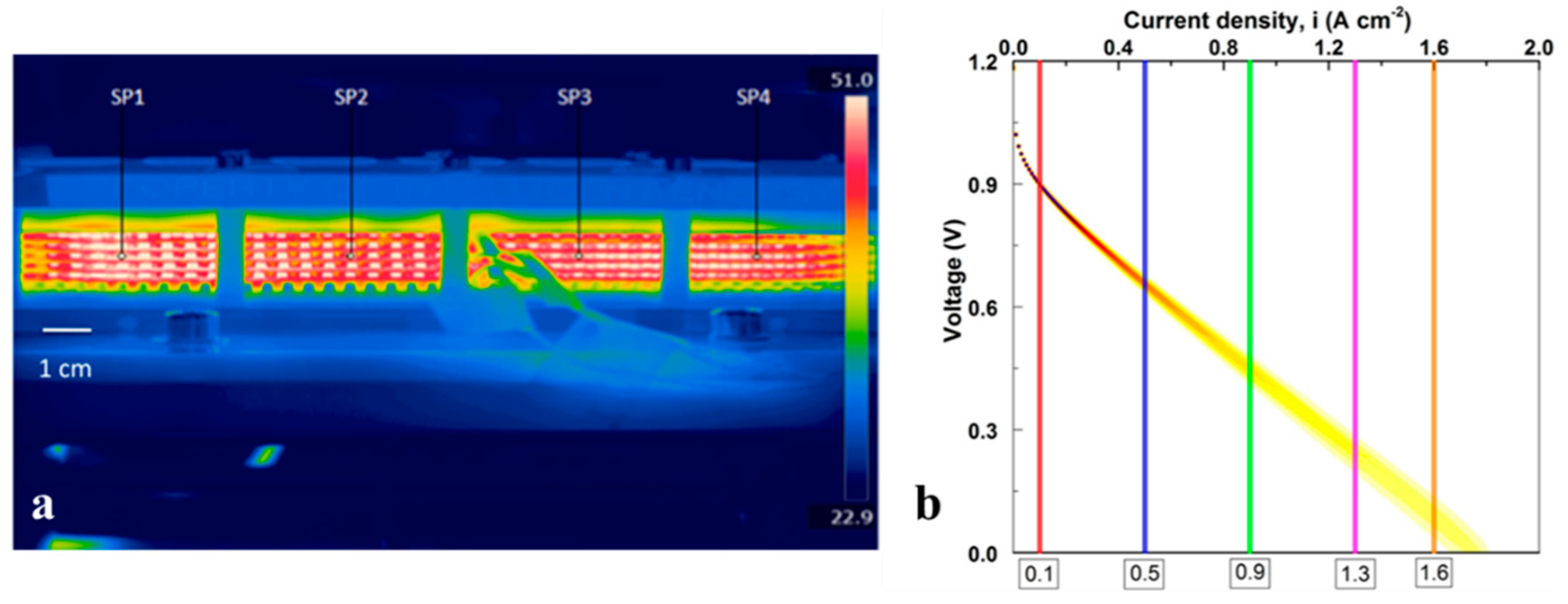 Results obtained by Noorkami et al. [55] highlighting the potential use for thermal imaging as a tool to inform models. Shown is: (a) a snapshot from images used to obtain statistically relevant temperature distributions from a commercial PEMFC stack which were later used to perform sensitivity analysis on the fuel cell polarisation curve; (b) which shows the importance of considering a polarisation “area” or “band” when operating a fuel cell system. Reproduced with permission from [55].
