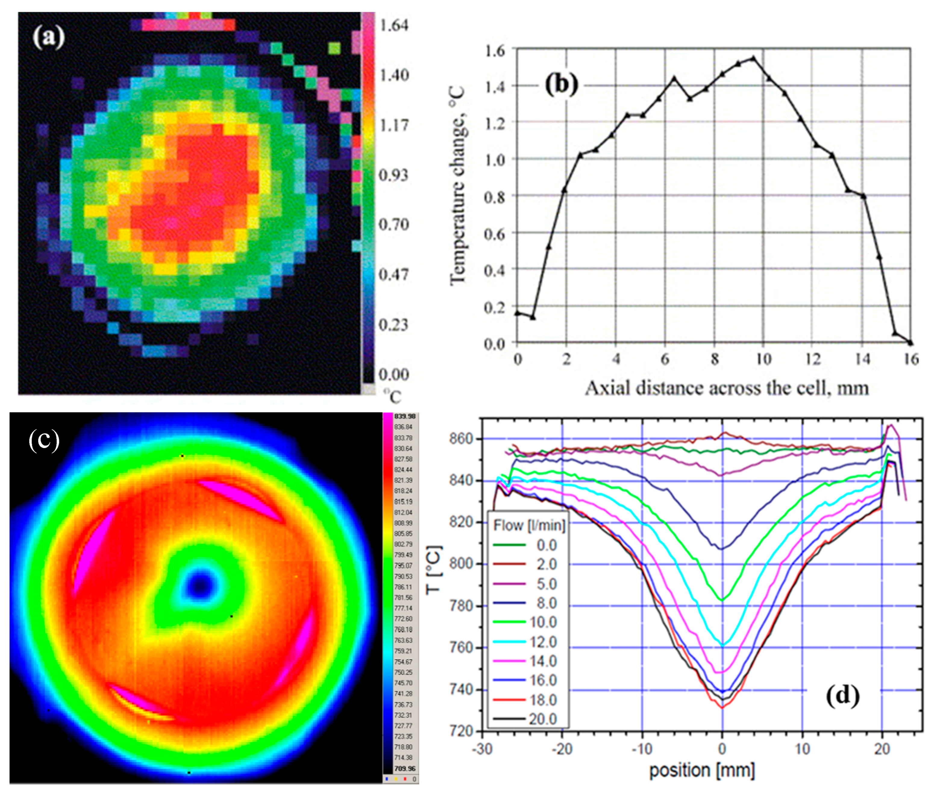 Infrared image (a) and temperature distribution (b) of a pellet SOFC [64]. Also shown is the effect of introducing a cool N2 stream to the surface of a SOFC cell (c) which is seen to generate large thermal gradients (d), as reported by Schöttl and Brett [65]. Reproduced from [64] with permission from Elsevier.