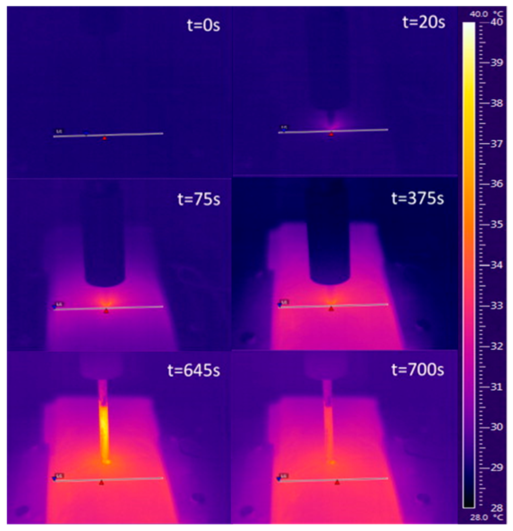 The failure of Li-S batteries was investigated by Hunt et al. who performed the industrially standard nail penetration test on such cells [68]. In doing so the effect of this critical safety test on the surface temperature distribution on the cells was examined. This test (shown in Figure 12) is used to evaluate the safety of battery systems to penetration by metallic objects with the associated short circuiting has been observed to cause substantial temperature rises in traditional Li-ion cells [69,70].