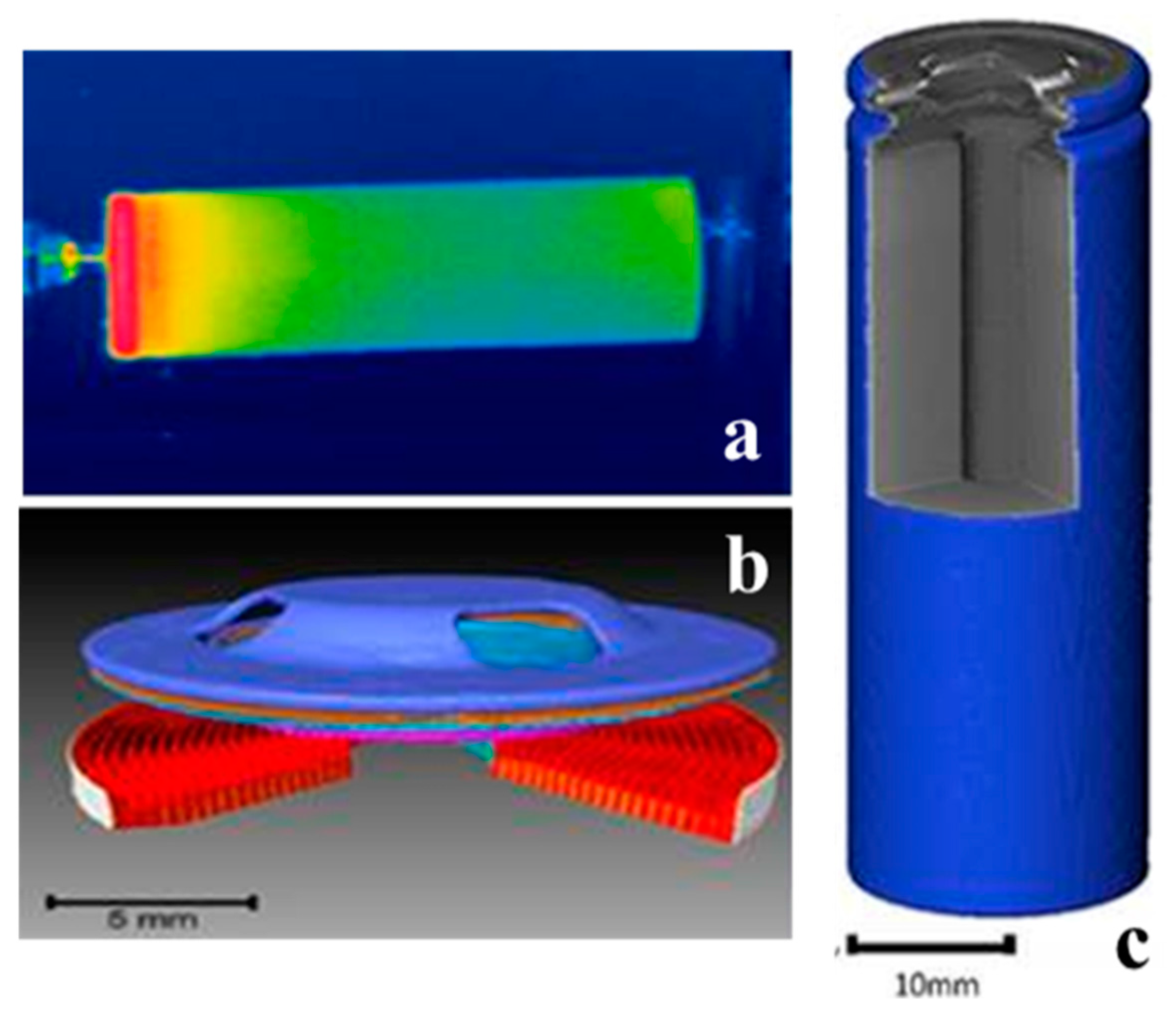 Representation of the correlative metrological approach employed by Robinson et al. [74] which ascribed the non-uniform temperature distributions (a) observed in 18,650 Li-ion cells under discharge to the presence of safety mechanisms within the cell housing (b). Also shown (c) is the reconstructed bulk of the battery which was investigated to ensure the heating was not caused by internal defects. Reproduced from [74] with permission from Elsevier.