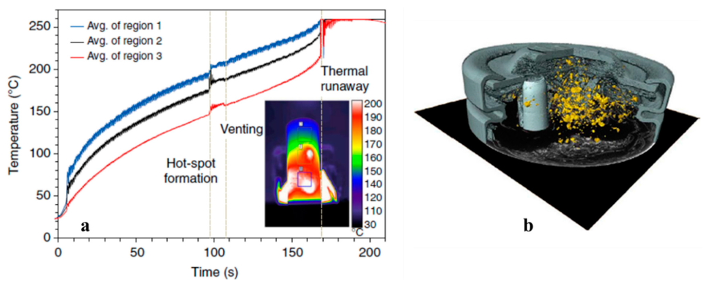Synchrotron radiation was employed by Finegan et al. to investigate thermal runaway in Li-ion cells [75]. This condition, which causes catastrophic failure of the cells, was examined in operando through a series of radiographic and tomographic measurements highlighting its devastating impact upon the internal structure of the cells highlighted in Figure 15. Infrared imaging was used to measure the surface temperature of the cells while it was subjected to thermal abuse designed to simulate conditions which would be experienced in the event of a fire. It was observed that thermal runaway occurred when the surface temperature of the cell was within the region 230‒260 °C. Hotspots were observed appearing on the surface of the cell using infrared imaging which is indicative of internal short circuits during the experiment. The Joule-Thompson effect was also observed through thermal imaging on the opening of the internal pressure relief valve. Transient thermal gradients in excess of 700 °C were reported across the 65 mm diameter cell with the internal temperature of the cell reaching in excess of 1085 °C as evident copper globules formed by the melting of internal current collector material.
