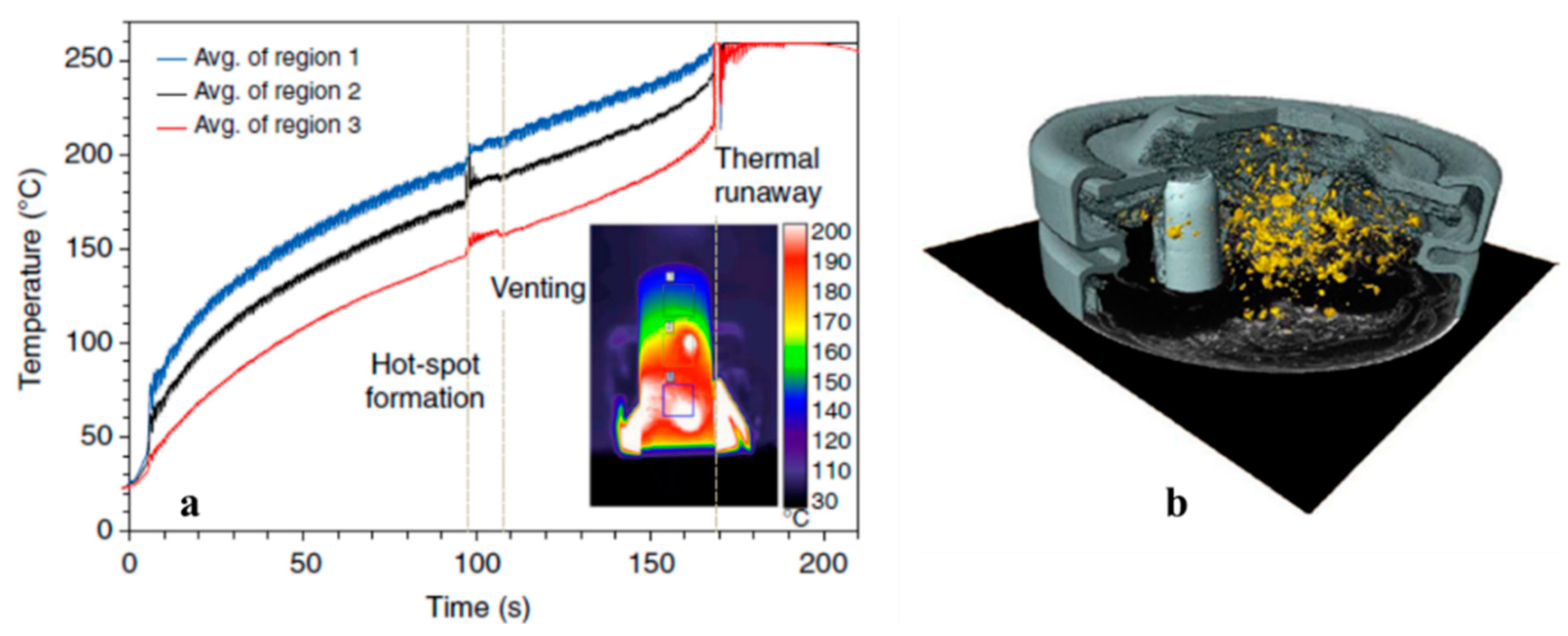 Temperature measurements obtained by Finegan et al. [75] showing: (a) the onset of thermal runaway and (b) post mortem tomographic reconstructions of the top of the cell after failure. Copper globules formed during the cell failure are shown in gold and indicate a temperature of 1085 °C within the cell during the failure process. Reproduced under Creative Commons CC license from [75].