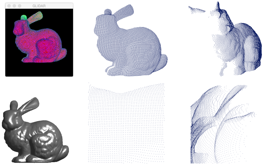Glidar uses the green and blue channels to store depth information (top left) and outputs a point cloud sampled from the visible surfaces of the object (displayed from a variety of angles and ranges on the right). Shown at bottom left is a normal 3D rendering of the original model, the Stanford Bunny, which is available from the Stanford 3D Scanning Repository [21].