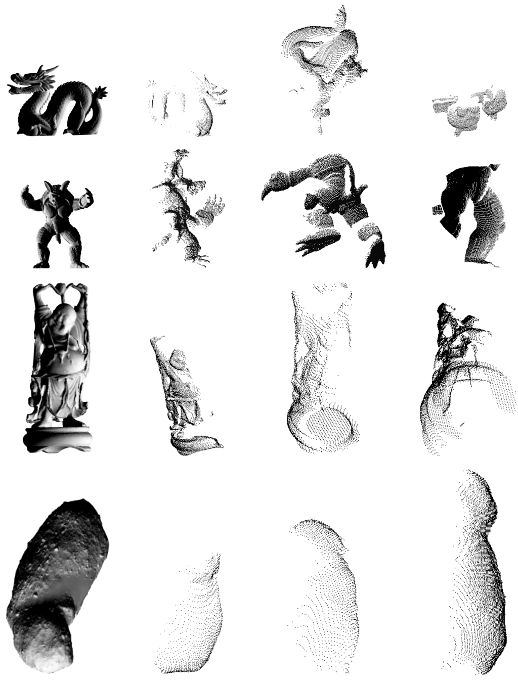Glidar can quickly produce depth images of objects from different orientations, with differently shaped and sized fields of view, and at a variety of ranges. The left-most column consists of four models which we used to produce the point clouds in the other columns. The first three models (Dragon, Armadillo, and Happy Buddha) are from the Stanford 3D Scanning Repository [21]. The fourth is the asteroid 25143 Itokawa, and was obtained from then the NASA Planetary Data System [22] and glued together and exported into ply format using Blender [23].
