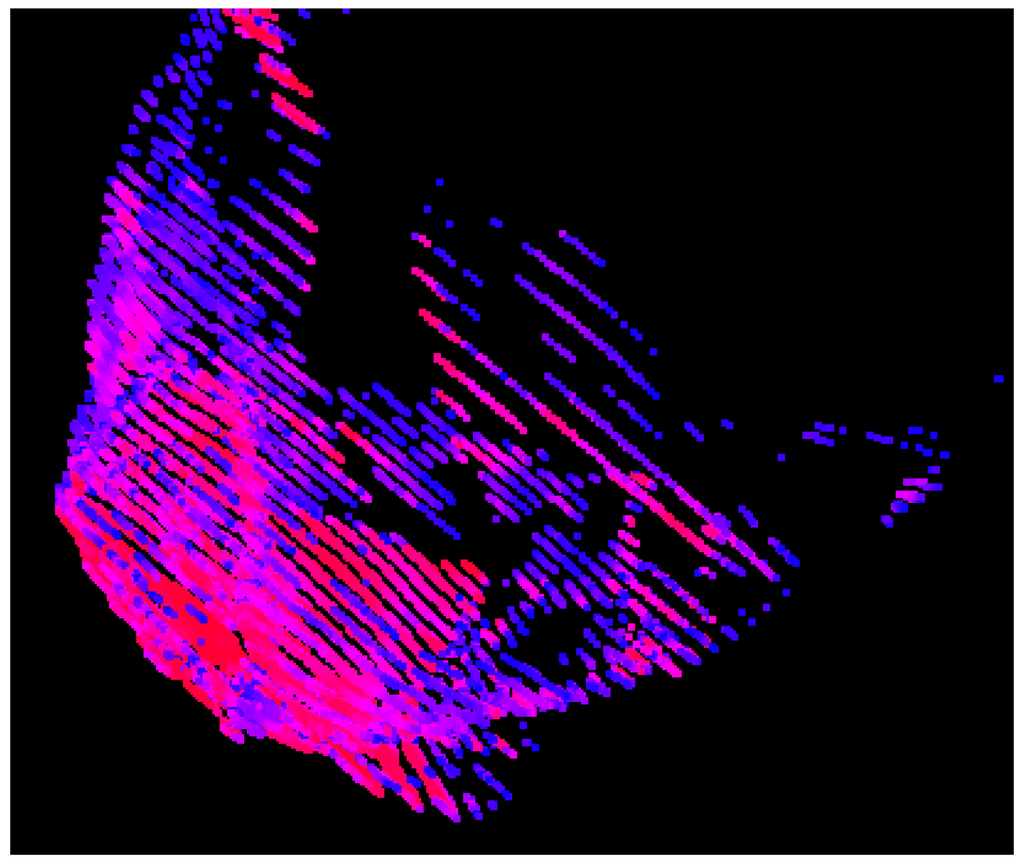 Glidar can apply model texture information to affect the intensity and normals of a model when producing depth images. In this illustration, the solar panel textures from the International Space Station’s Functional Cargo Block module are visible as differing intensities in the point cloud. The texture map used in this example is meant to be illustrative of Glidar’s capability to consider texture, rather than to represent the actual appearance of such an object; accurate representation of structures in the near-infrared would likely require generation of custom textures. This particular model is a component of Nasa’s high-resolution iss scene in Lightwave format, obtained from [28].
