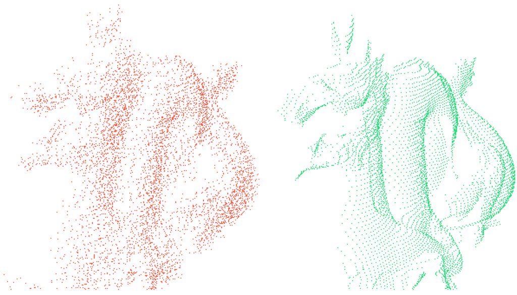 An additive noise model may be included in the fragment shader to apply device-specific range errors. Shown above are point clouds sampled from the Stanford dragon, with additive noise (left) and without any noise (right). We hope to include texture-based noise in the future.