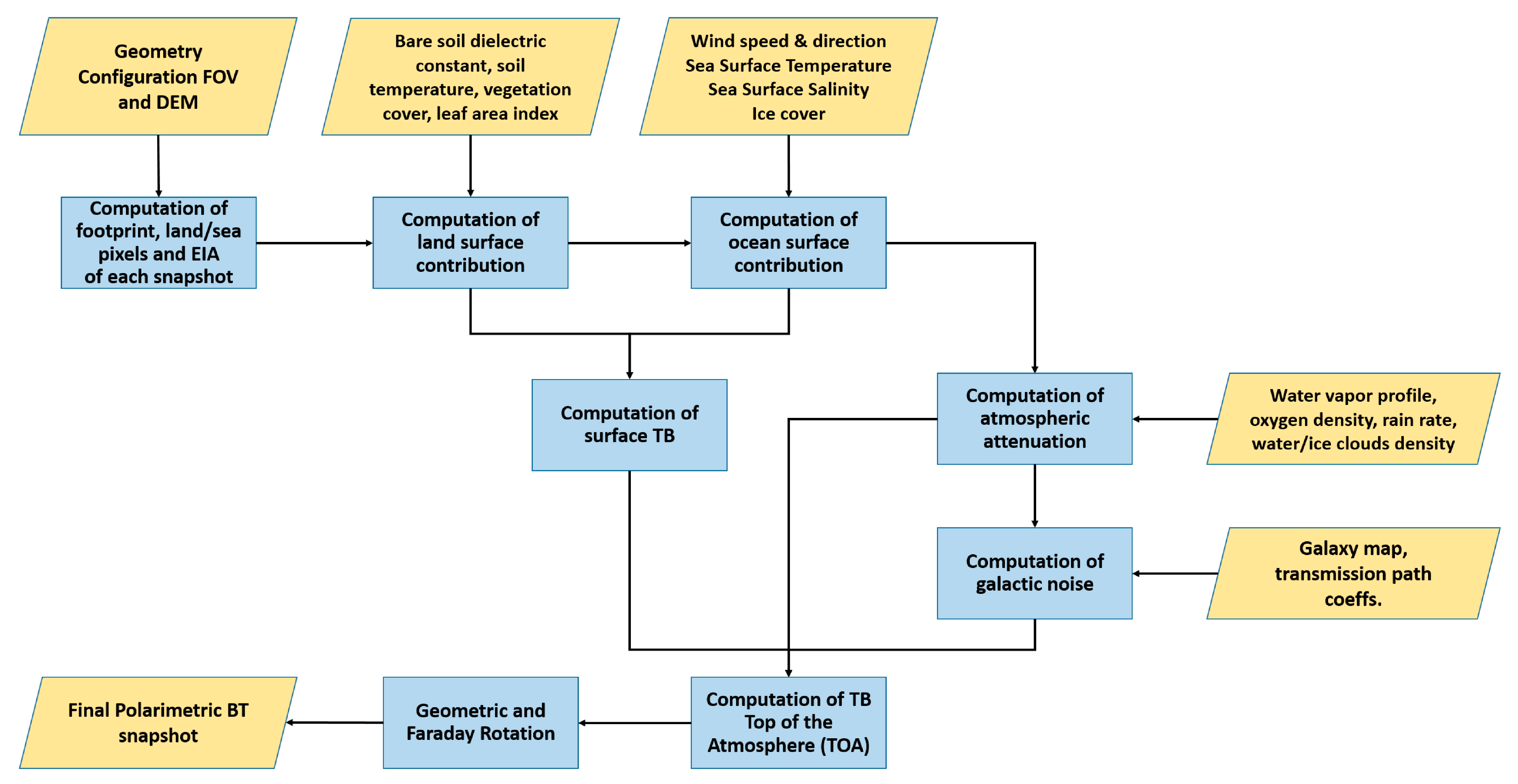 - Land surface contribution computation, including bare soil emission, vegetation-covered soils emission, ice and snow, and other effects, such as rocky soil, urban areas, inland water bodies, and topography effects,