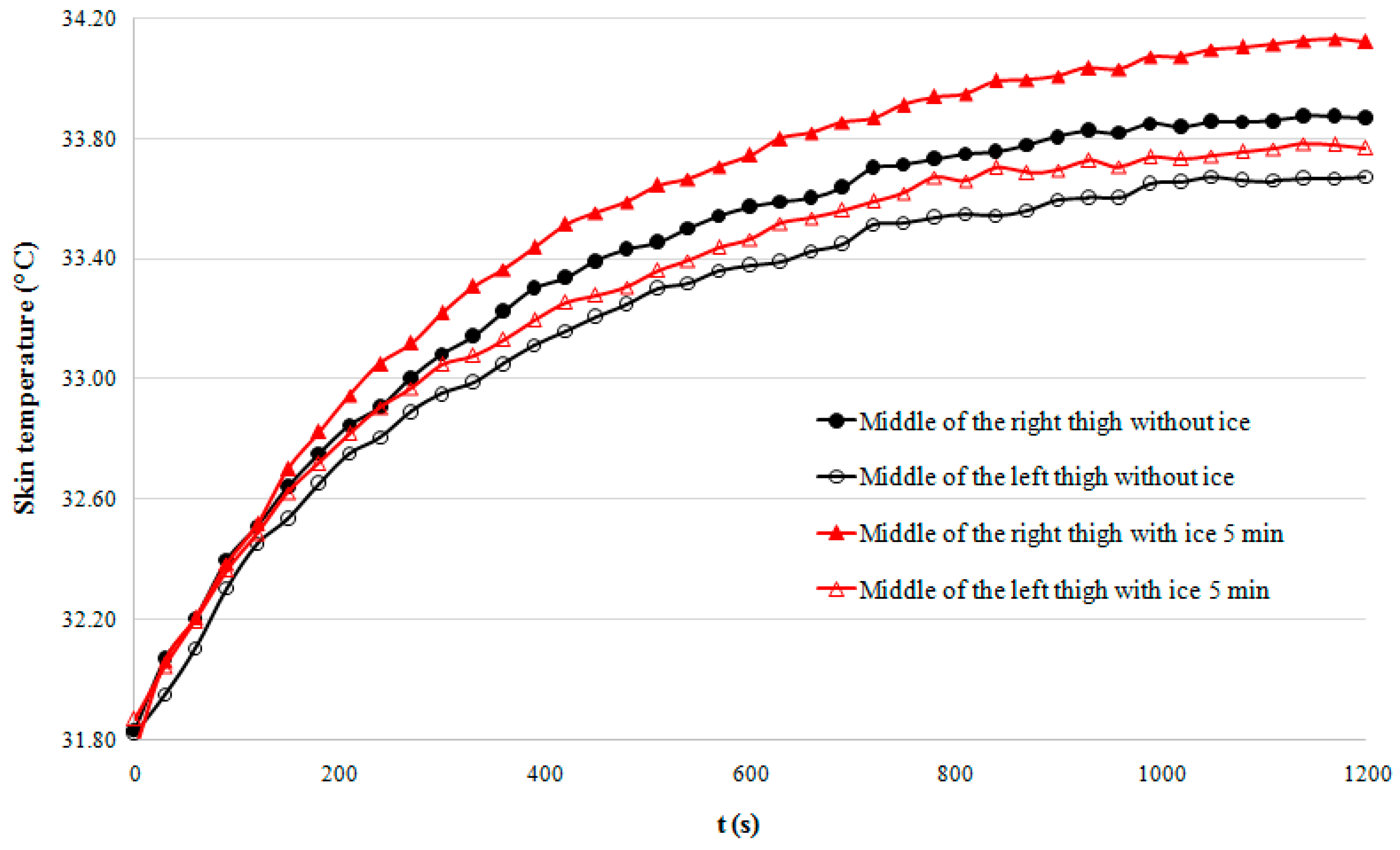 Statistical analyses show that the rate of warming was no different with or without ice on the contralateral limb (in our study, left). Similarly, temperatures do not differ significantly according to the thigh environments.