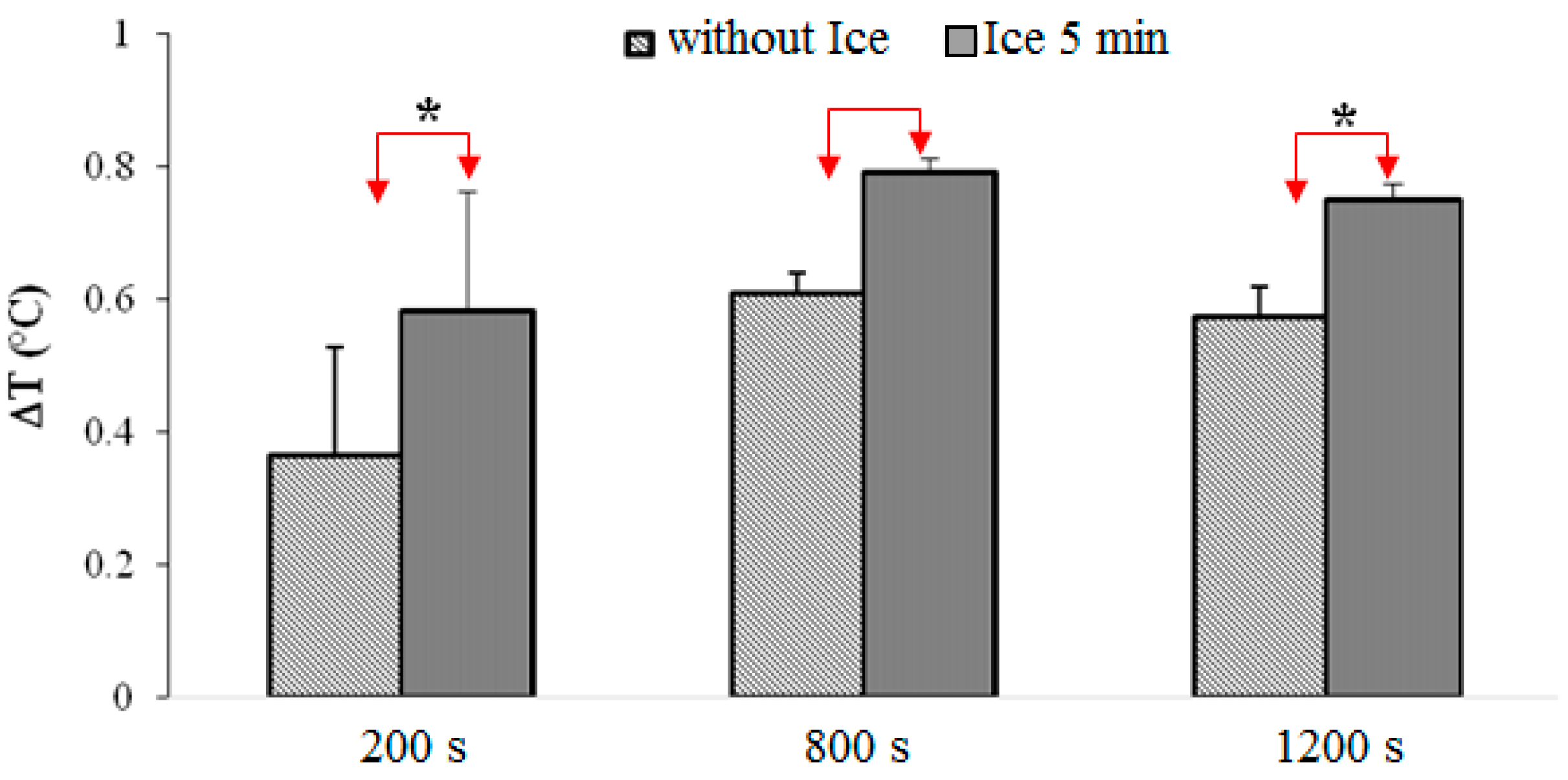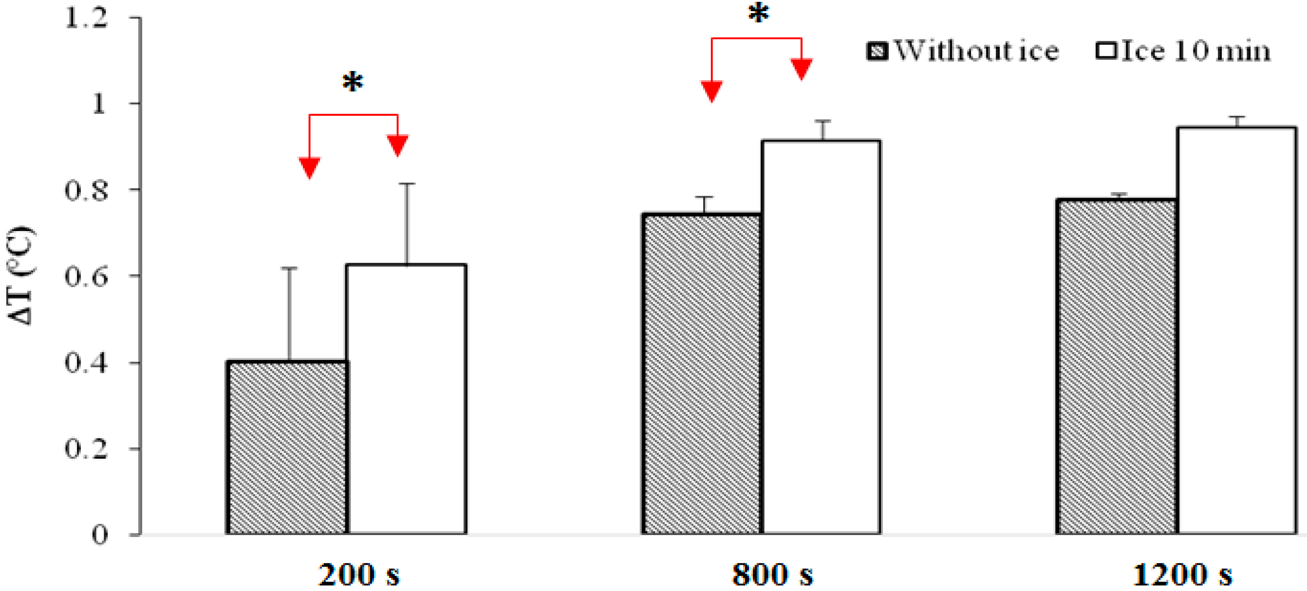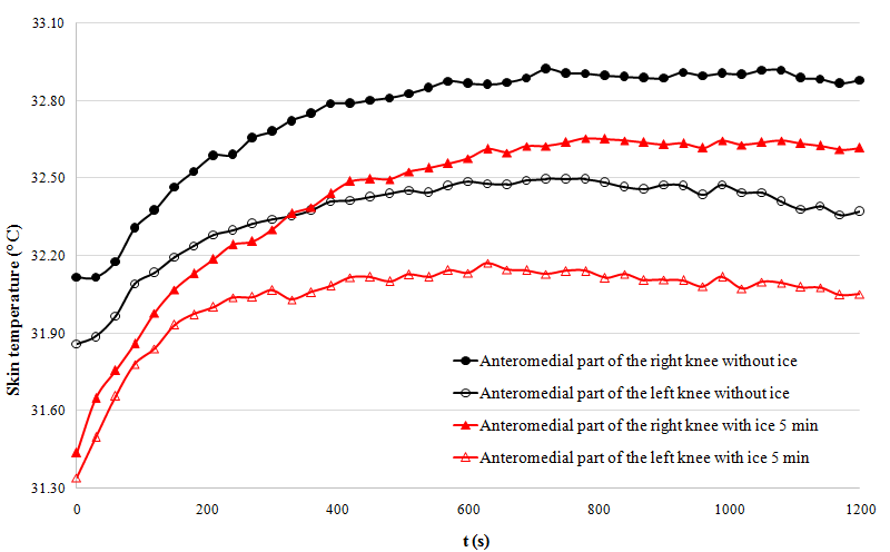 One may averaged temperature over 400 s for each experiment to compare it. There are significant differences between measurements taken without ice and with ice for 10 min near the anteromedial part of the right knee during the first 800 s (Figure 4).