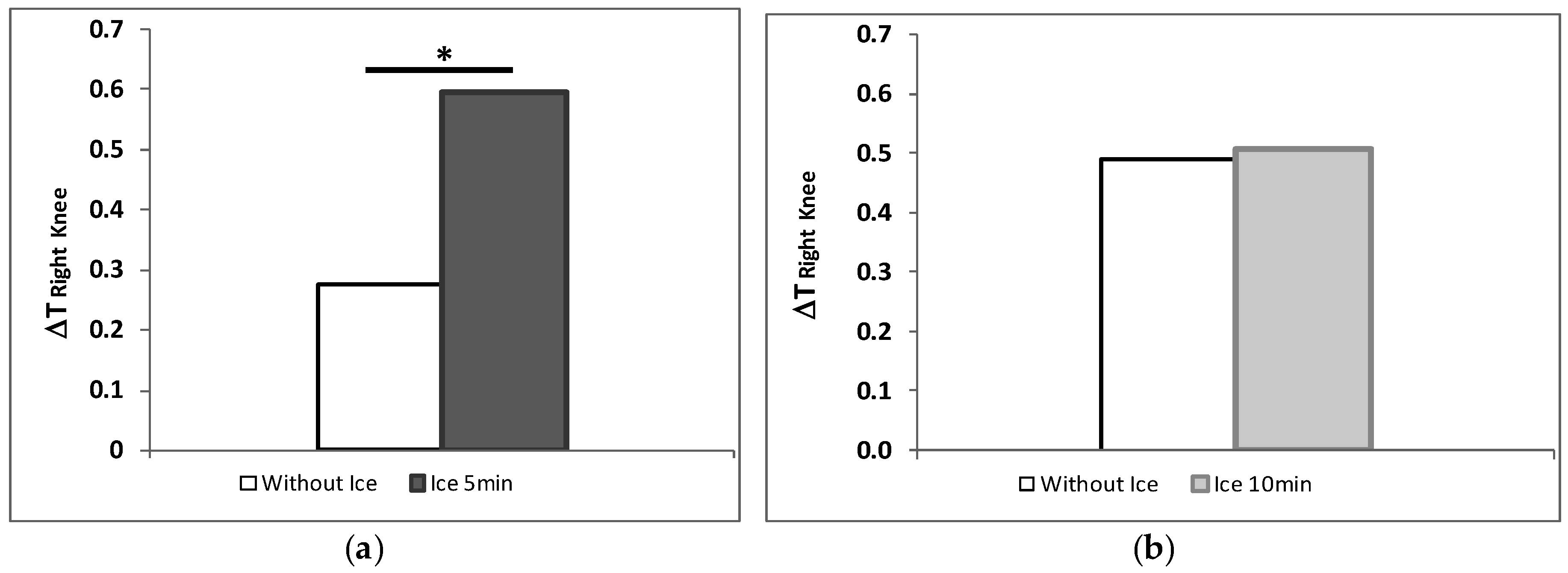 Variation in average temperatures in the skin of the left knee, comparing (a) exposure to ice for 5 min and no exposure to ice and (b) exposure to ice for10 min and no exposure to ice. *: Significant difference p < 0.001.