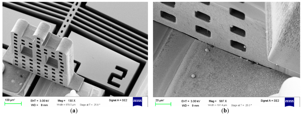 Scaning electron microscopy (SEM) image of a 3D interconnected microelectricomechanical system (MEMS) structures: (a) the low magnification image shows the entire structure; and (b) the high magnification image shows the area of interest.