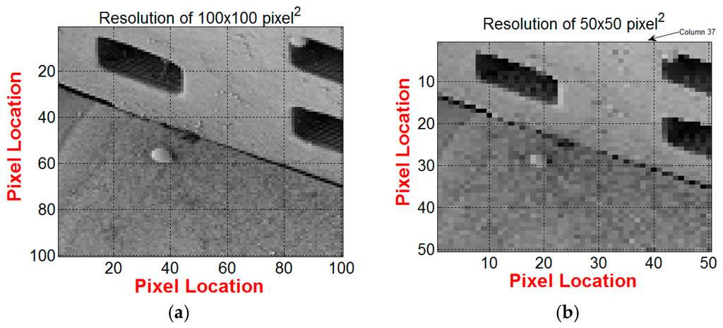Gray scale images extracted from SEM picture in Figure 1b: (a) Resolution is reduced down to 100 × 100 Pixel2; (b) Resolution is reduced down to Pixel2.