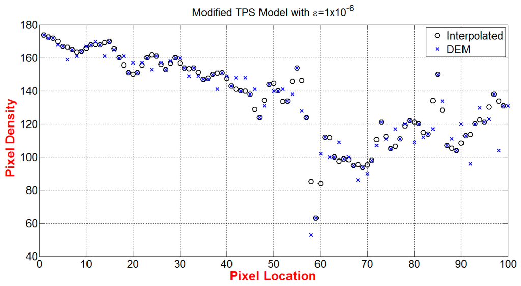 We use the global modified TPS method to double the resolution of the 50 × 50 Pixel2 image in Figure 4b. The pixel intensity is based on a grayscale image with a maximum intensity value of 256. The intermediate points, which bisect the mid distances between every two adjacent pixels in column 37 of Figure 4b, are interpolated using Equation (3).