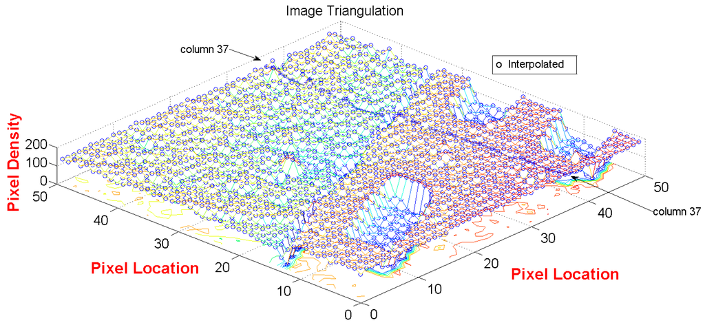 where is the number of samples, and the true values of vector are obtained from original image of 100 × 100 Pixel2 shown in Figure 4b. The total error based on the modified TPS with ɛ = 10−6 is calculated at column 37 and it is equal to 363.5187. It should be noted that the intermediate points suffer from small deviation from the true value as shown in Figure 5 and as noted by the non-zero values of accumulative error . The estimated value of a pixel at the DEM location is equal to the true value, i.e., coincident. This is shown in Figure 6, which plots three superimposed micro-surfaces in three dimension: (1) the triangulation of true pixel of image in Figure 4b; (2) the interpolation of the entire image whose pixels are evaluated at the location of each true pixel by using the Modified TPS method described in Section 2.3.1; and (3) the intermediate pixels which are interpolated along column 37.