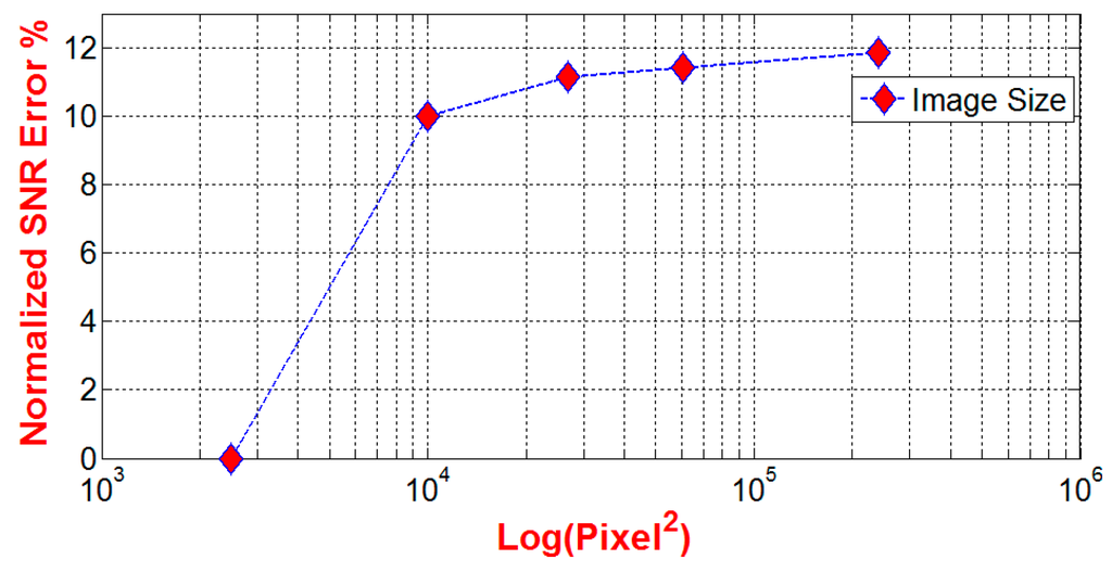 The last performance measure of the modified TPS method is to understand how the SNR value varies with the number of the interpolated pixels in a given image. We use the source image of 50 × 50 Pixel2 in Figure 4b to increase the image resolution by using modified TPS method, and with ɛ = 10−6. The interpolation is carried out to interpolate the intermediate points between pixels, and with step up resolutions as indicated in Table 3. It can be concluded that the value of the calculated SNR increases as the resolution of the reconstructed image increase, however, to understand how such change is related to the size of the reconstructed image relative to the true image, we define SNR error percentage by . Where is the signal-noise ratio of the reconstructed image, and is the signal-noise-ratio of the true image used in the reconstruction. The simulation results in Figure 7 shows exponential convergence of β. i.e., the signal-to-noise ratio of a reconstructed image has maximum limit where it reaches saturation at certain pixel resolution. In this case study, the pixel resolution that corresponds to the saturation limit could be obtained from the following suggested fit-model: , where is the pixel intensity expressed by , and is a set of undetermined coefficients. The fit analysis is carried out by using MATLAB “fittool” GUI function. The coefficients are evaluated and found equal to . The “goodness of fit” is evaluated by using the regression coefficient, R2, which is equal to 0.9999. The final value of the fit-model, , can be found by using “limit theory”, and it gives , i.e., . The pixel intensity that corresponds to 1% within the range of the final value of is ~381 × 381 Pixel2. This explains that the SNR value of the reconstructed image would not change significantly at high resolution.