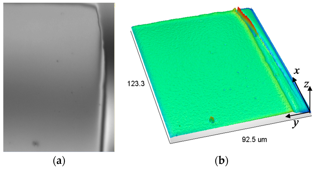Gold coated electrical-pad of a MEMS silicon micro-surface: (a) 50X optical image; (b) Triangulation of a measured micro-surface area of 92.5 μm × 123.3 μm.