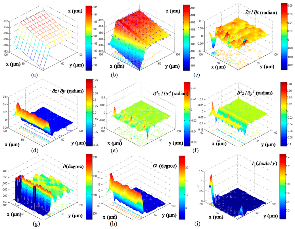 A smaller data set of 10 × 10 Pixel2 is uniformly sampled from the DEM at a lateral pixel resolution of 0.965 µm. Figure 9a shows a linear triangulation of 100 control points covering an area of 92.5 µm × 123.3 μm. Equation (8) is applied to extract the TPS coefficients, and then the micro-surface is constructed at a smaller pixel size of 0.5 µm by using Equation (3). Figure 9b shows a continuous and smooth micro-surface that passes through all the 100 control points. The variation of the slopes in the x and y coordinates are obtained from Equations (9) and (10), and then they are plotted at 0.5 µm resolution, as shown in Figure 9c,d, respectively. Similarly, the curvature variation in the x and y coordinates are constructed by using Equations (11) and (12), with the results shown in Figure 9e,f, respectively. These later micro-surfaces measure the topography fluctuation; where a spiky point implies that there is a saddle point close to right angle. The strike angle in Equation (15) is a measure of the topographical contour slopes. Figure 9g shows a reconstruction of the strike micro-surface; i.e., non-uniform fluctuation of strike angles within ±90° range. The dips micro-surface in Figure 9h is constructed from Equation (17), and it shows positive inclination orthogonal to the strike line. The bending energy in Figure 9i is constructed from Equation (18), and it shows the bent variation in the micro-surface due to curvatures. The nodes, which are located on the infinite part of the extrapolated micro-surface, have negligible bending energies; therefore, the energy index can be used to detect the sudden changes within micro-surface such as holes, groves, and standing features in MEMS structures.