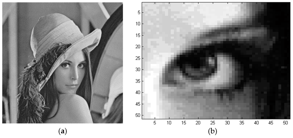 Grey intensity image: (a) Lena Image; (b) A sub-image zoomed in the eye area of 51 × 51 pixels2.