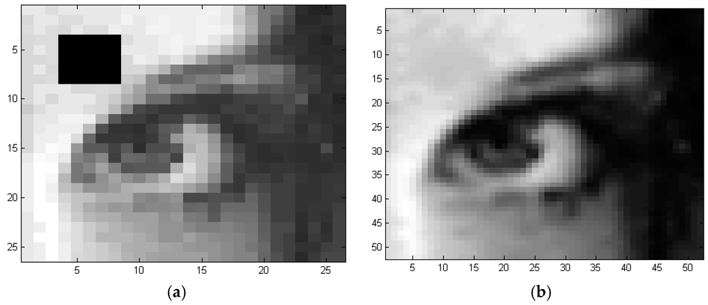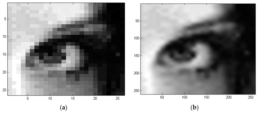 Reconstruction from few control points by using global TPS algorithm: (a) Low resolution image containing 26 × 26 Pixels2; (b) Reconstructed at a higher resolution of 260 × 260 Pixels2.