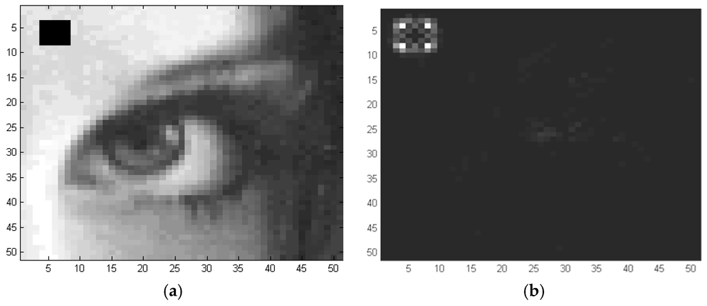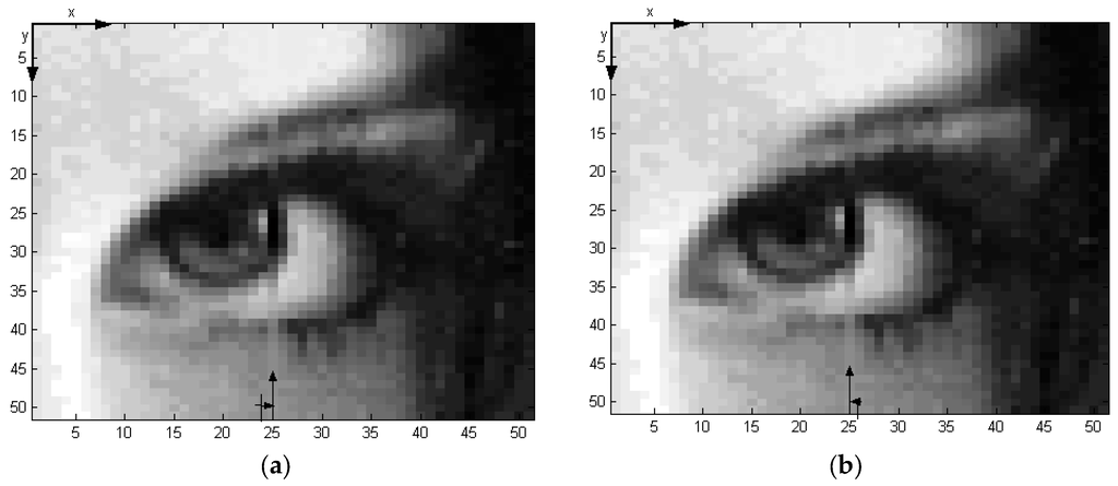 SEM imaging suffers from the following shortcomings: (1) higher magnification leads to smaller field of view; therefore warping multiple images is needed for larger view; (2) high magnification often causes some damages to the specimen due to high electron field; therefore, there might be a need to filter out defects; and (3) high magnification could be non-feasible; therefore, there might be a need to reconstruct a higher resolution image from the lower magnification image. Because our algorithms can be applied to any greyscale SEM image, we select a standard picture from the image processing literature that is analogues to SEM images, and the goal is to guide the readers with the comparison. In this section, a noise-free Lena image [38], which is shown in Figure 10a, has a resolution of 512 × 512 Pixel2, and it is used to study the image processing techniques discussed in Section 4. A sub-image of 51 × 51 Pixel2 is extracted from the Lena image as shown in Figure 10b. This later image will be used throughout this section.