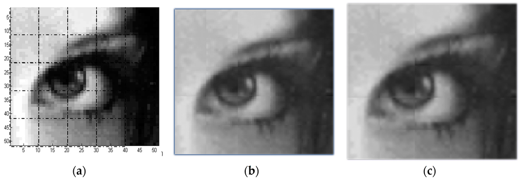 Reconstruction by using local TPS method: (a) A 50 × 50 Pixel2 image is divided into 25 square windows; (b) Reconstructed image at resolution of 100 × 100 Pixel2; (c) Reconstructed image at resolution of 250 × 250 Pixel2.