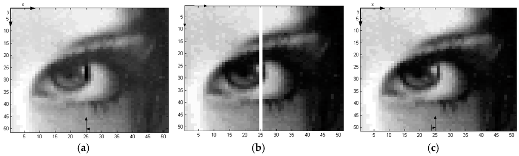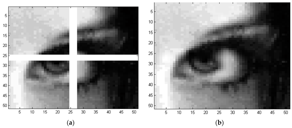 Figure 15a shows an image torn into four pieces, where the white area refers to the missing control points whose spatial locations (x,y) are known. The goal is to warp the pieces into a single image by using global modified TPS, local modified TPS and LSE-TPS methods. First, in the global modified TPS method, the missing pixels are evaluated by using the control points from all the four pieces together. The missing pixels are constructed at same image resolution, and the result is shown in Figure 15b. Second, the local TPS is used to warp the torn image in Figure 16a. The control points, which are located in the left or right part of the torn image, are used separately in the reconstruction of the missing pixels that are located in column 25. Figure 16b,c are reconstructed by using the information in the left part, and right parts, respectively.