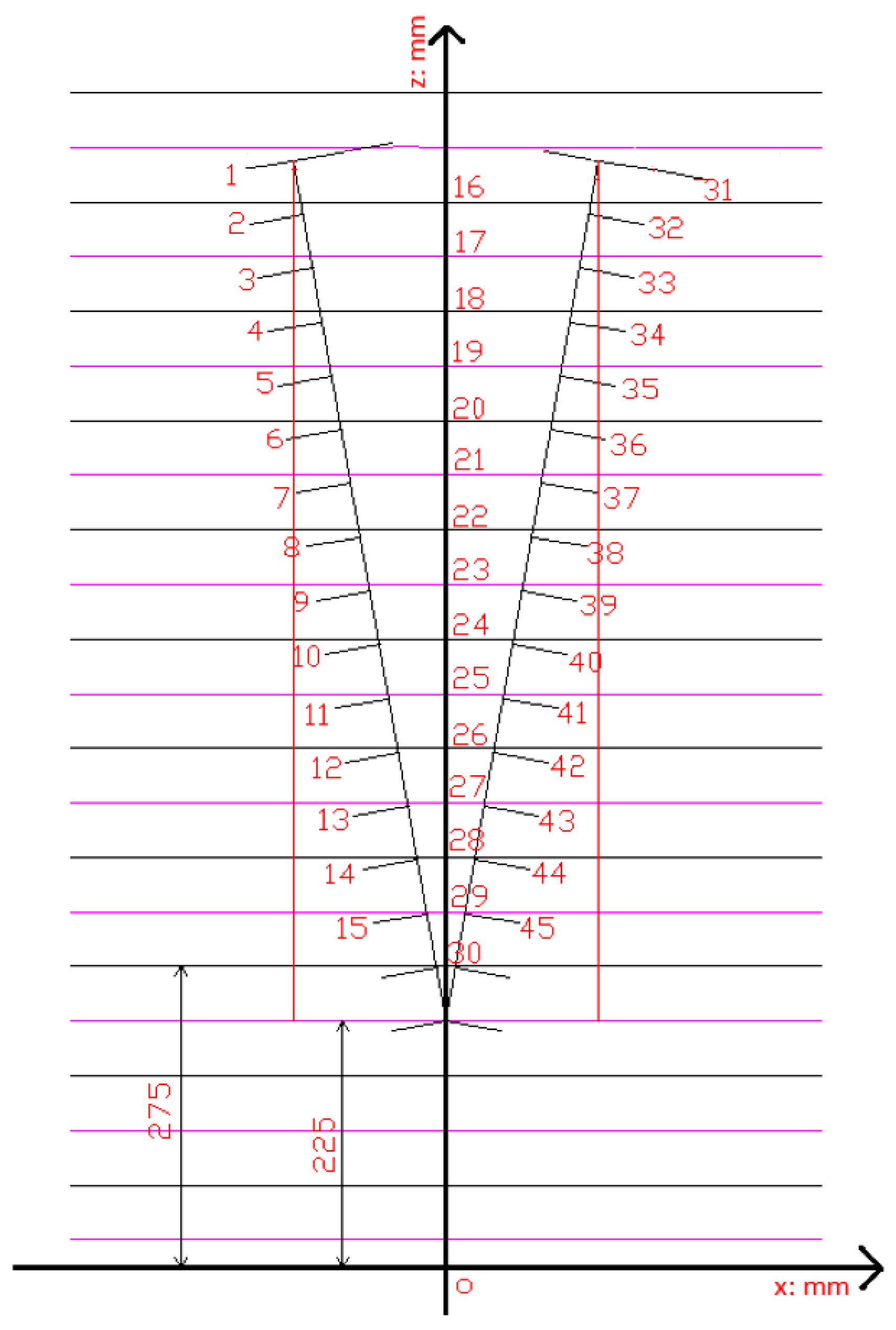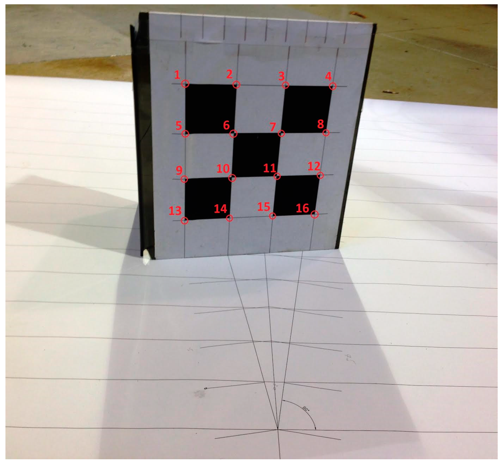 The external camera parameters provided by Zhang’s [38] method were built on each checkerboard’s own coordinate system, not on the same world coordinate system. In order to build the same world coordinate system, a large 2D x-z coordinate system was plotted on an A0-size paper, together with a vertical checkerboard (Figure 2), and all of these provided the 3D ground truth on the same coordinate system. The detailed 2D x-z coordinate system is shown in Figure 3. Each line in the x-z plane was at 50 mm spacing. The middle line (oz) was rotated −10° around Oorig to get the left line, and rotated +10° around Oorig to get the right line. The checkerboard was then placed at different locations on the left, middle, and right line (marked as 1 through 45 in Figure 3). The 3D coordinates of each corner on the checkerboard, at each location, could be solved as the ground truth. Two images were taken at each location from the left and right cameras. From these 2D images, the 2D projection of these corners could also be solved.