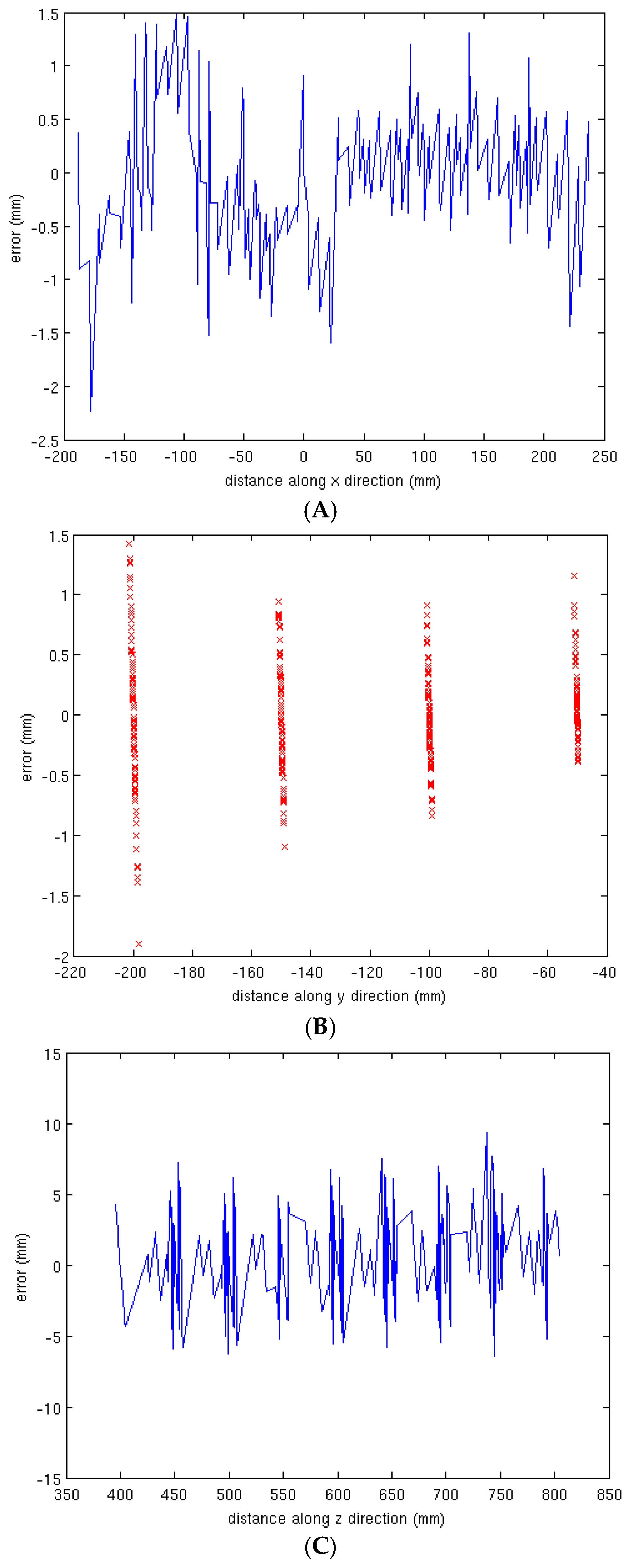Error plots in X, Y, and Z direction. (A) errors in x direction; (B) errors in y direction; (C) errors in z direction.