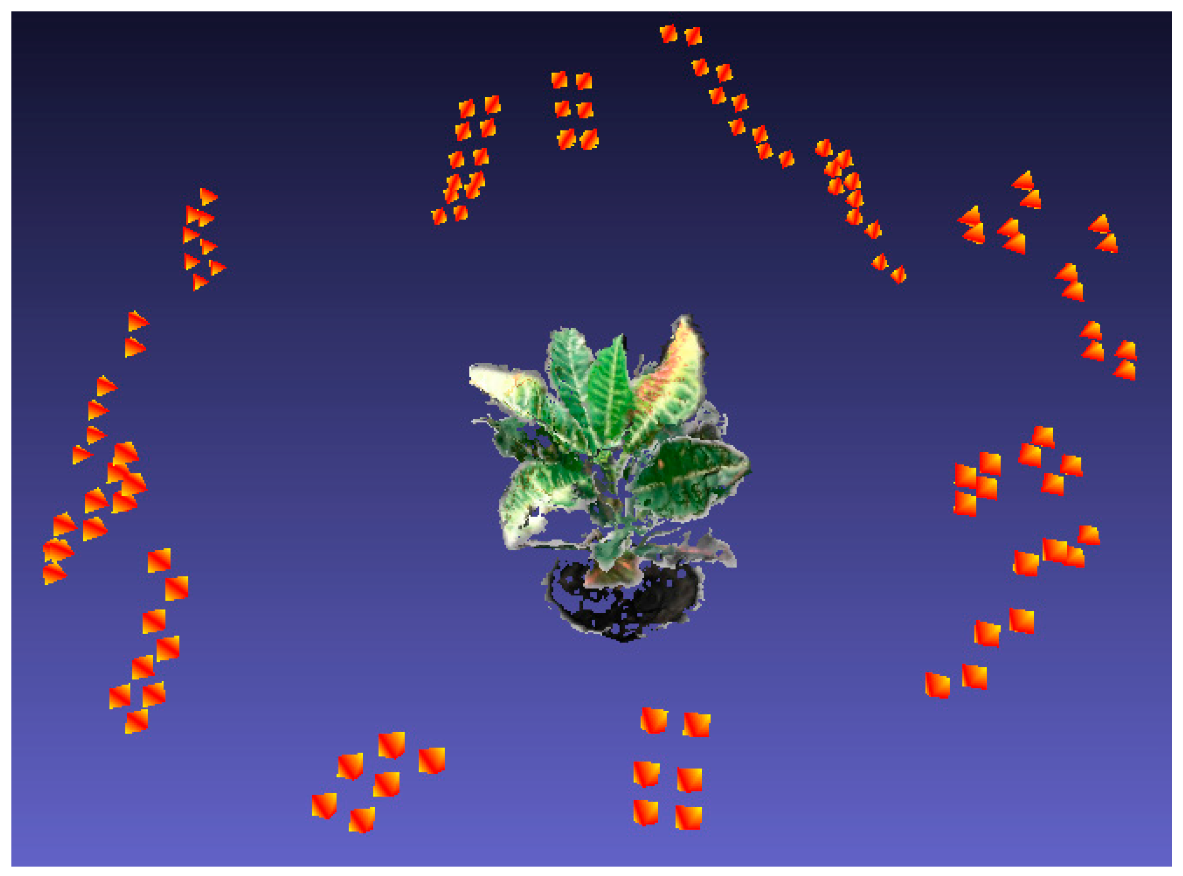 VisualSFM, which was proposed by Wu [37], integrated three technologies together: feature points detection and matching [35], multicore bundle adjustment [53], and dense 3D reconstruction [33]. Multiple images from a full view of the plant/tree would be imported into this software. A fully reconstructed result would be generated through the previously mentioned three steps.