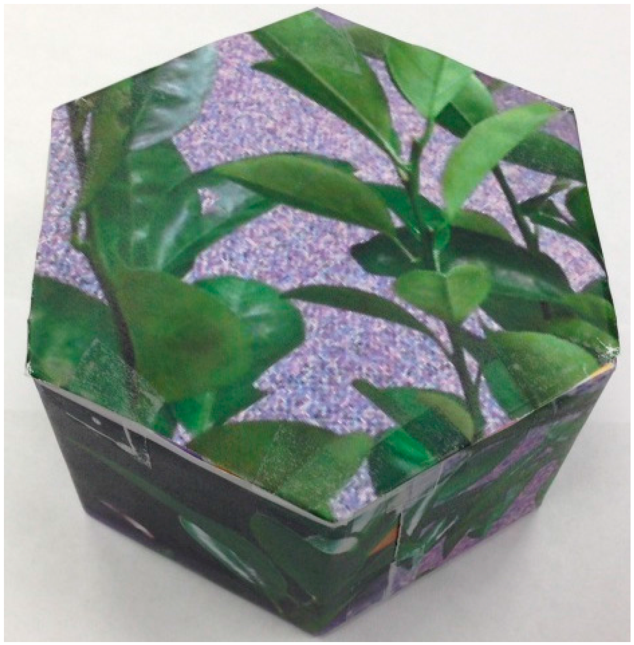 Test 1: A hexagon box with a given geometry was used to verify the reconstruction result. The box was placed on the top of a table. The stereo camera was manually moved around the box to take the images. Images taken at the adjacent locations should have some overlap, which is good for feature matching. The side length of the hexagon is 64 mm, and the height is 70 mm. To give the box texture, paper with printed citrus leaf images was wrapped around the box, as shown in Figure 6. Approximately 86 images were taken from various positions around this box using the stereo camera. The box was first reconstructed by using VisualSFM [37]. The result is shown in Figure 7A. The box was then was reconstructed by applying the metric reconstruction method (mentioned in step 2.8). The result is shown in Figure 7B, which shows the real size of the target.