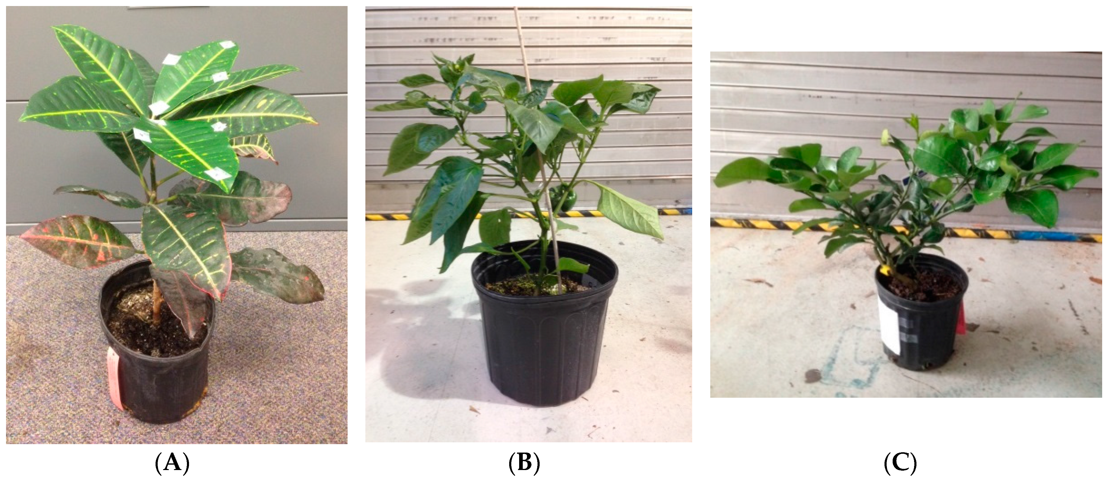 Experimental plants/tree: (A) Croton plant; (B) Jalapeno pepper plant; (C) Lemon tree.