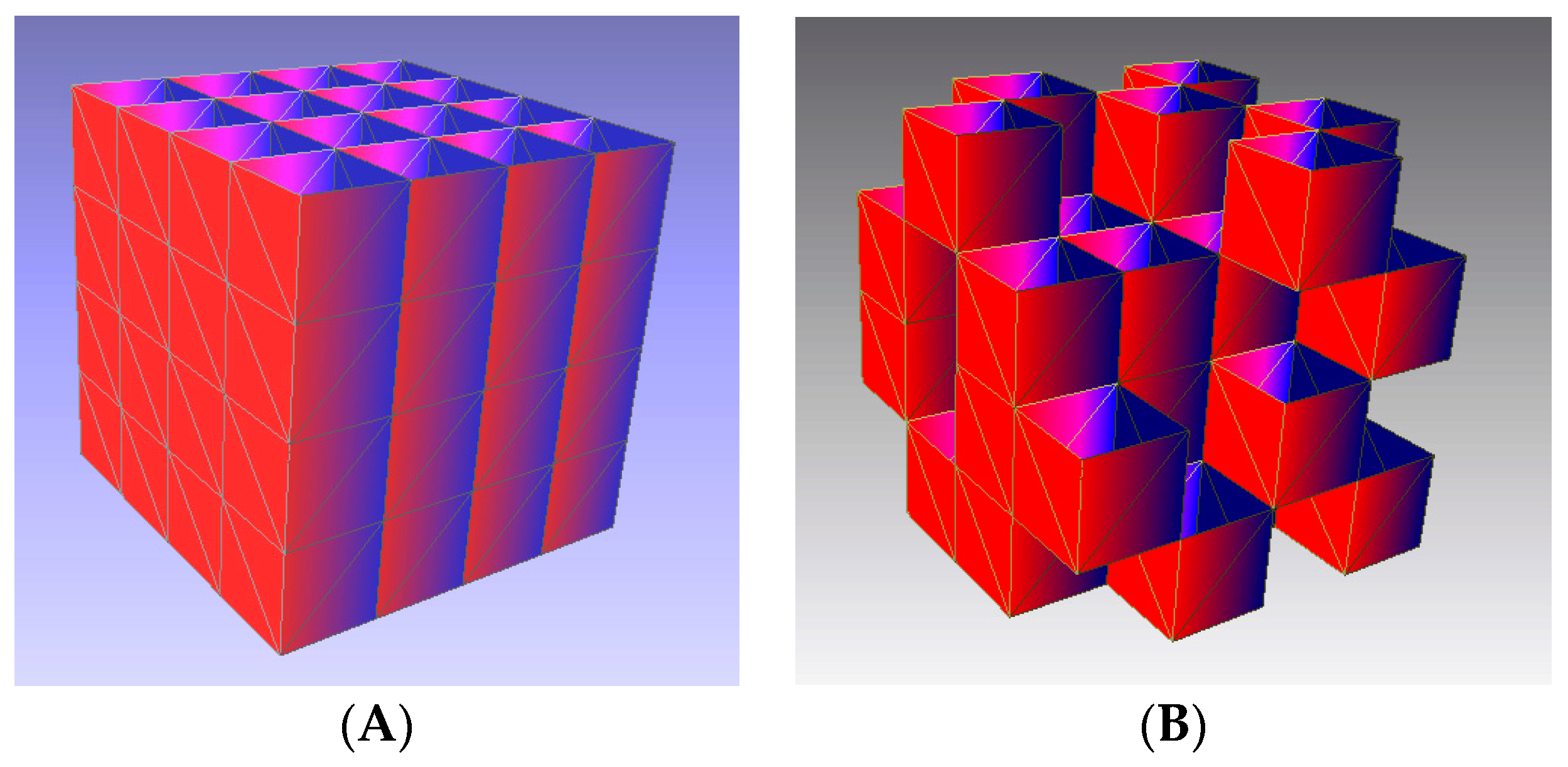 Demo of volume calculation. (A) Bounding box was divided into voxels; (B) Voxels left after removing unused voxels.