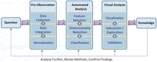 A visual analytics framework consists of multiple components that reflect a complete analytic cycle (see Figure 1). From the goal or question, the knowledge is gained through pre-observation, automated analysis and visual analysis processes. In addition, it is essential to validate a method by the outcomes in the discipline that the method is used. To do this, visual analytics techniques must adapt their visualisation and interface to the respective discipline and conform to the language and norms expected of that discipline. For example, the expression of identified significant genes is required to be validated by the domain experts when the analysis is undertaken in independent laboratories.