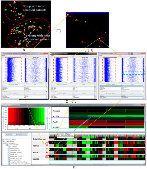 The seamless visual analysis from the overview of the entire patient population in the similarity space (A); focused patients at a navigational stage (B); to patient-to-patient comparison view of raw data outputs from a data collection step, (left) Affymetrix gene expression and (right) Illumina SNP, both ordered to chromosomal location (C) and, finally, to the genes of interest view (D).