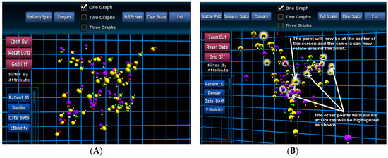 An overview of the patient population in the similarity space in a Unity3D environment, (A) at the navigational stage and (B) when highlighting the patients. This visualisation provides a smooth, ergonomic and gaming-friendly environment to analysts.