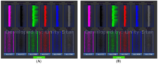 Gene comparison in Unity 3D environment where (A) displays the genetic property of six selected patients (top → microarray values and bottom → SNPs values) and (B) shows the visualisation of the other six patients when the genetic panels of patient ALL302 are overlaid with patient ALL53.