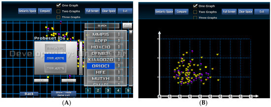Figure 5A shows a visualisation when genes and probe sets of the selected genes are selected for re-arranging the similarity space based on an individual or a group of genes. Figure 5B presents the new visualisation of the entire patient cohort based on the similarity of the two selected probe sets 207727_s_at and 216661_x_at of the gene MUTYH.