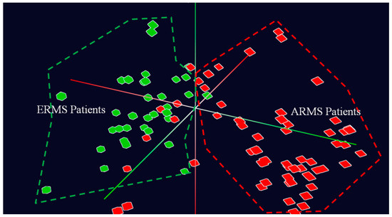 Figure 6 shows the overall view of the entire patient population captured in the dataset in 3D space at a navigational stage. This figure illustrates clearly two distinctive groups of patients, marked by two colours, including ARMS () and ERMS (). The fact that the two groups of patients are closely located together supports the hypothesis that genetic properties are essential to determine the molecular distinction between ARMS and ERMS patients.