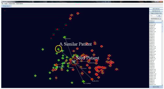 Similarity check through the patient population based on a particular patient and a probe set (e.g., 203184_at). Similar patients to the seed patient are visually shown with connected lines and are highlighted with golden colour outlines.