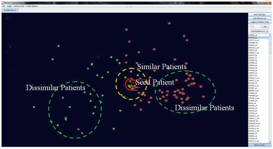 Our visualisation approach allows for the assessment of patient similarities based on individual based on individual features. When an object is selected as the POI, it is moved to the centre position while other objects rearrange their positions according to their genetic similarity with this seed POI. At this point, this becomes the centre point of rotation of the image. We also outline the similar patients and non-similar patients in and respectively (see Figure 7).