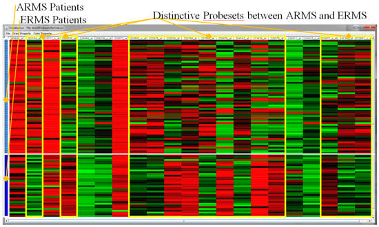 We found that it took 258 of the most important features identified to be able to clearly differentiate ARMS from ERMS. Interestingly, of the top three ranking features, two encode for fibrillin 2 (FBN2-203184_at and 215717_s_at), previously identified as having some prognostic value for clinical RMS management [41,42]. The 258 features show chromosomal translocation-negative ARMS were more genetically more similar to ERMS than to chromosomal translocation-positive ARMS, despite. The result of the feature selection project was supported by the findings of a recent report [38].