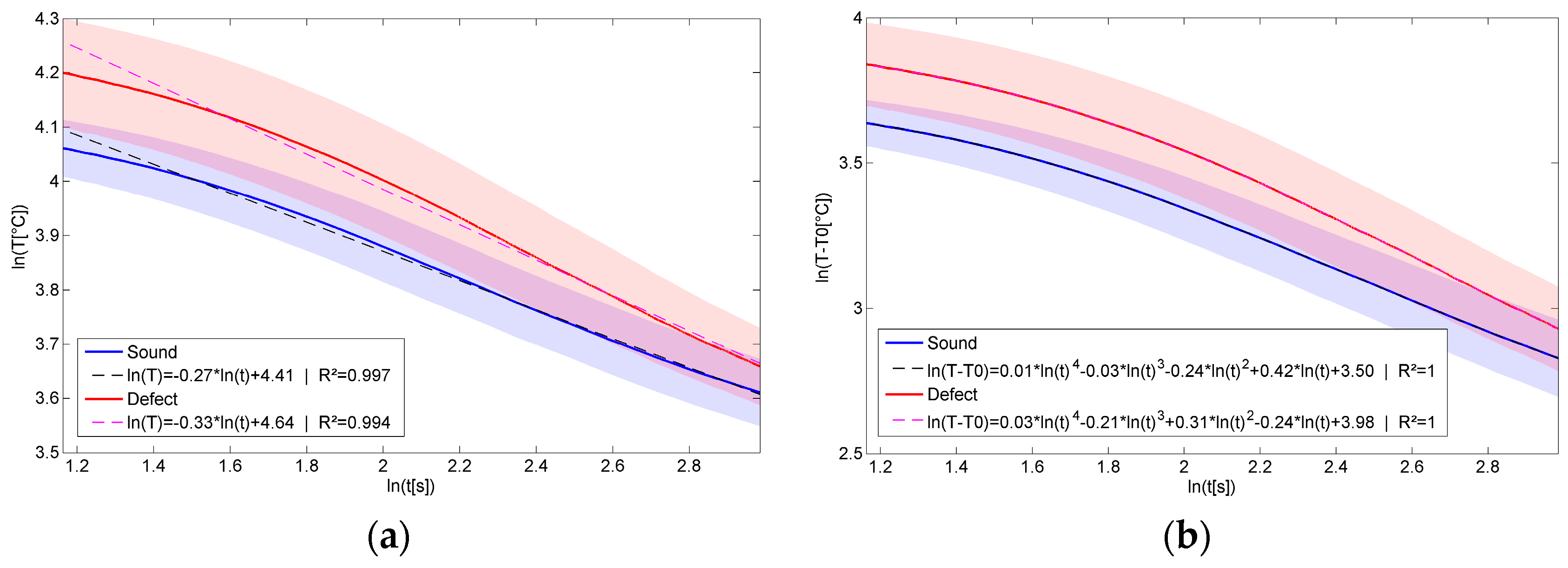 Figure 3 shows the mean cooling profiles calculated based on all sound (=clean) pixels and all defect (=contaminated) pixels of Sample 28. The standard deviation of these profiles was also calculated and is shown as a shaded region surrounding the mean profiles. The overlap in these shaded regions illustrates the challenge in the contaminant detection problem considered in this study. Moreover, it is clear from these profiles that within the time frame in which thermal images were recorded in this study, there are only subtle slope differences between sound and defective profiles. The first order fit on the versus profiles, as described in Section 4.3.2, is illustrated in Figure 3a. The thermal signal reconstruction applying a fourth order fit to the versus profiles is illustrated in Figure 3b. These figures show that the fourth order polynomial provides a better fit for the cooling profiles.