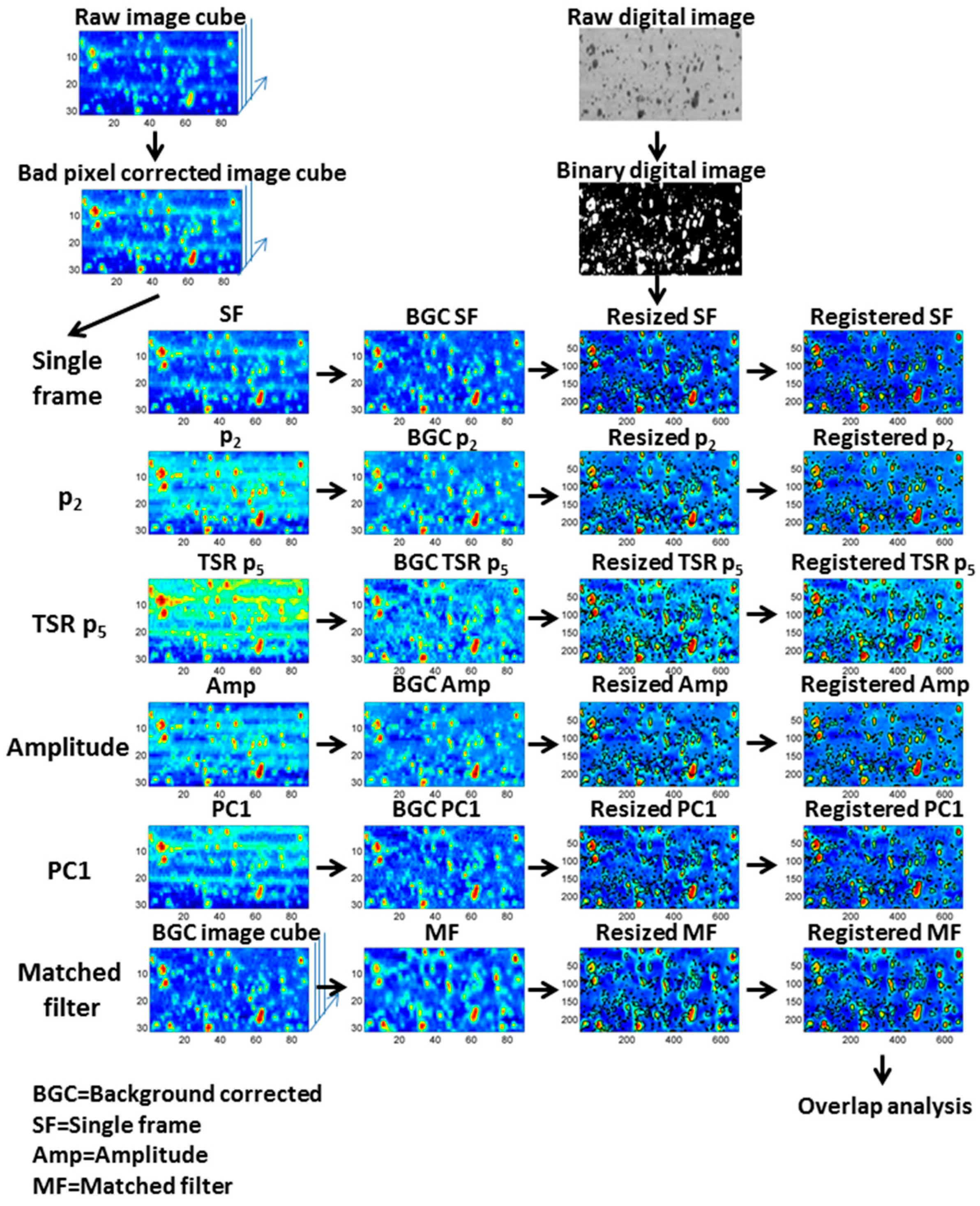 Overview of image processing steps. The input of all six thermal processing methods consists of a bad pixel corrected version of the raw thermal image sequences. The thermal output images of all methods are resized and registered to the digital reference images. Based on this, an overlap analysis and detection limit calculation is performed. The color scale of all images is normalized between zero and one to allow contrast comparison between the image processing algorithms. Coordinates are shown in pixels.