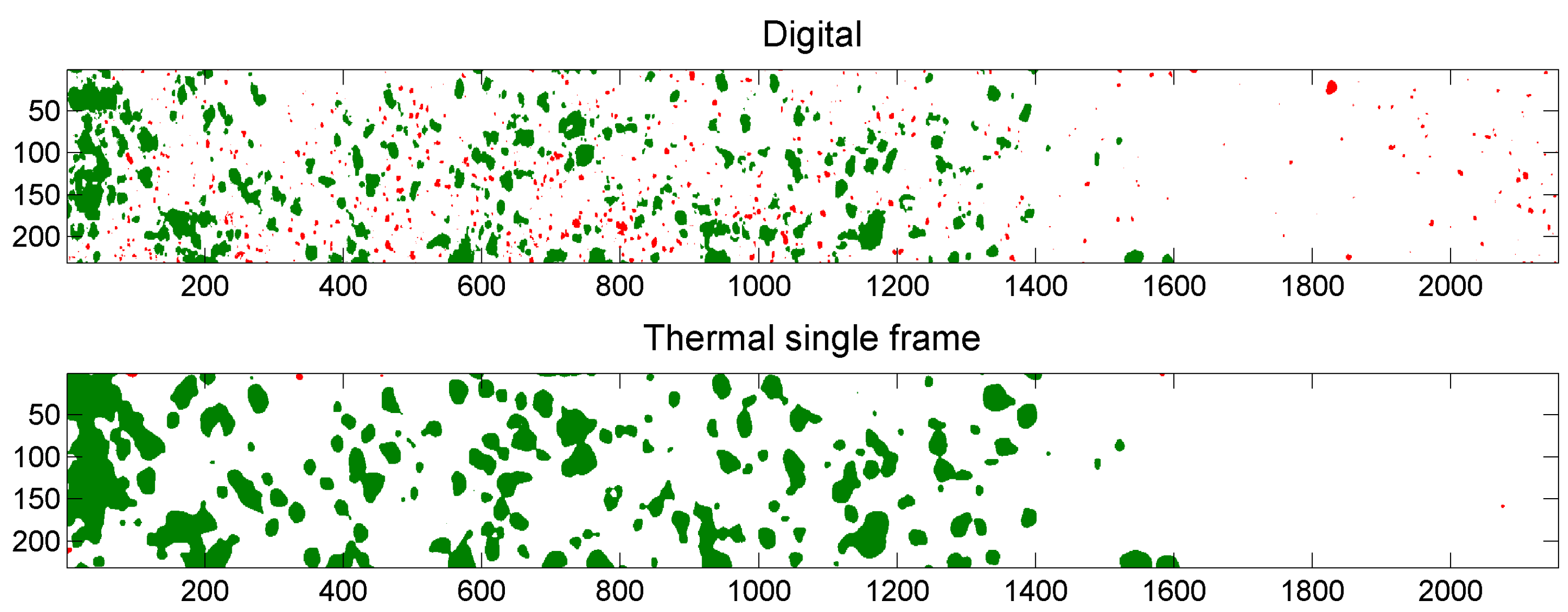 Binarized digital image (top); and binarized thermal output image “single frame” (bottom). Coordinates are shown in pixels. Particles that occur in both images are shown in green. Particles that occur only in the digital image or only in the thermal output image are shown in red in respectively the top image and the bottom image.