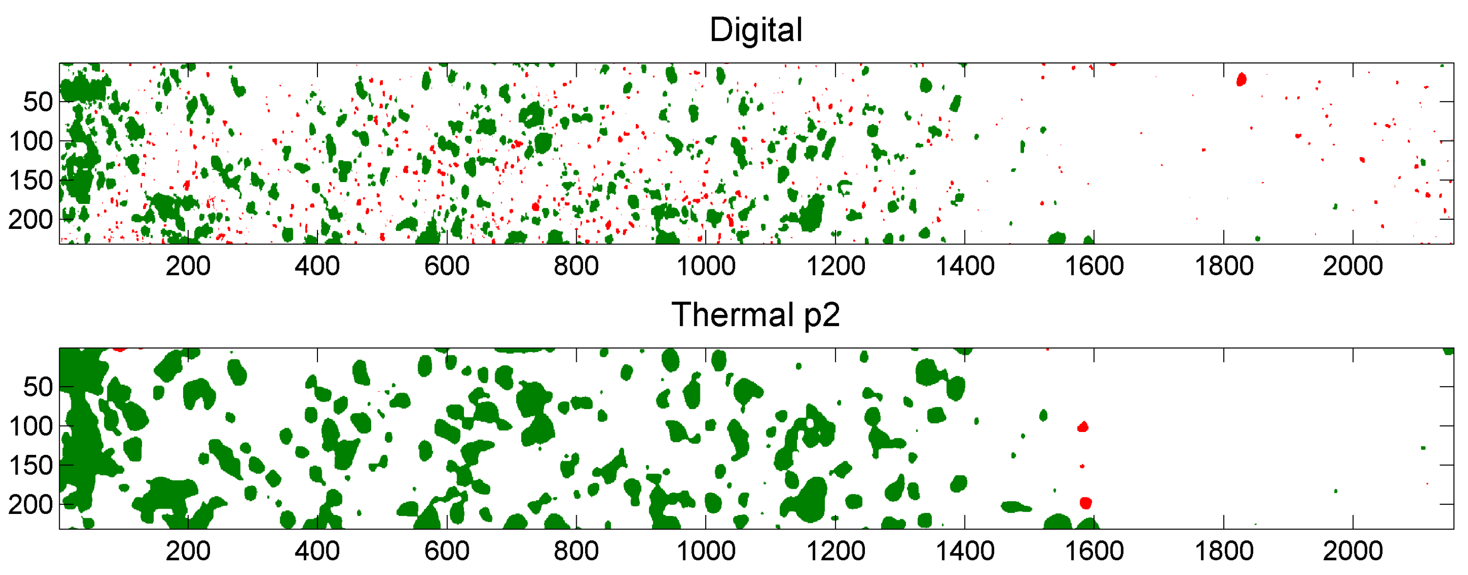 Binarized digital image (top); and binarized thermal output image “p2” (bottom). Coordinates are shown in pixels. Particles that occur in both images are shown in green. Particles that occur only in the digital image or only in the thermal output image are shown in red in respectively the top image and the bottom image.